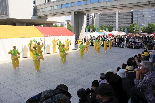 图4~7:在演出广场进行表演的天国乐团、打腰鼓、狮子舞和法轮功五套功法演示,吸引了很多观众(图) |