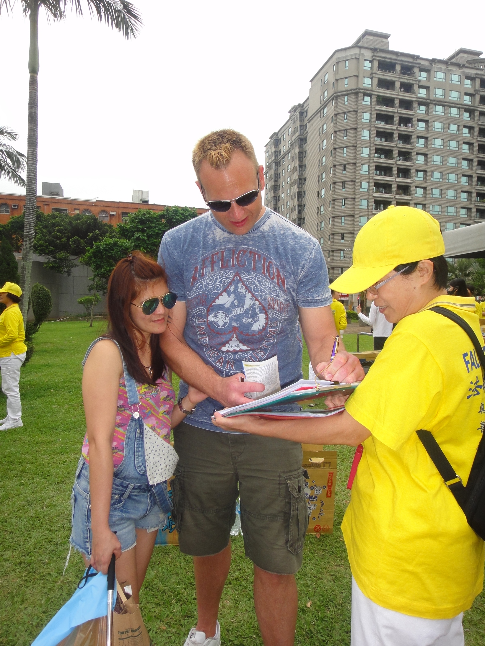 图15:美国波士顿来台出差的路易斯先生(右)签名支持法轮功反迫害
