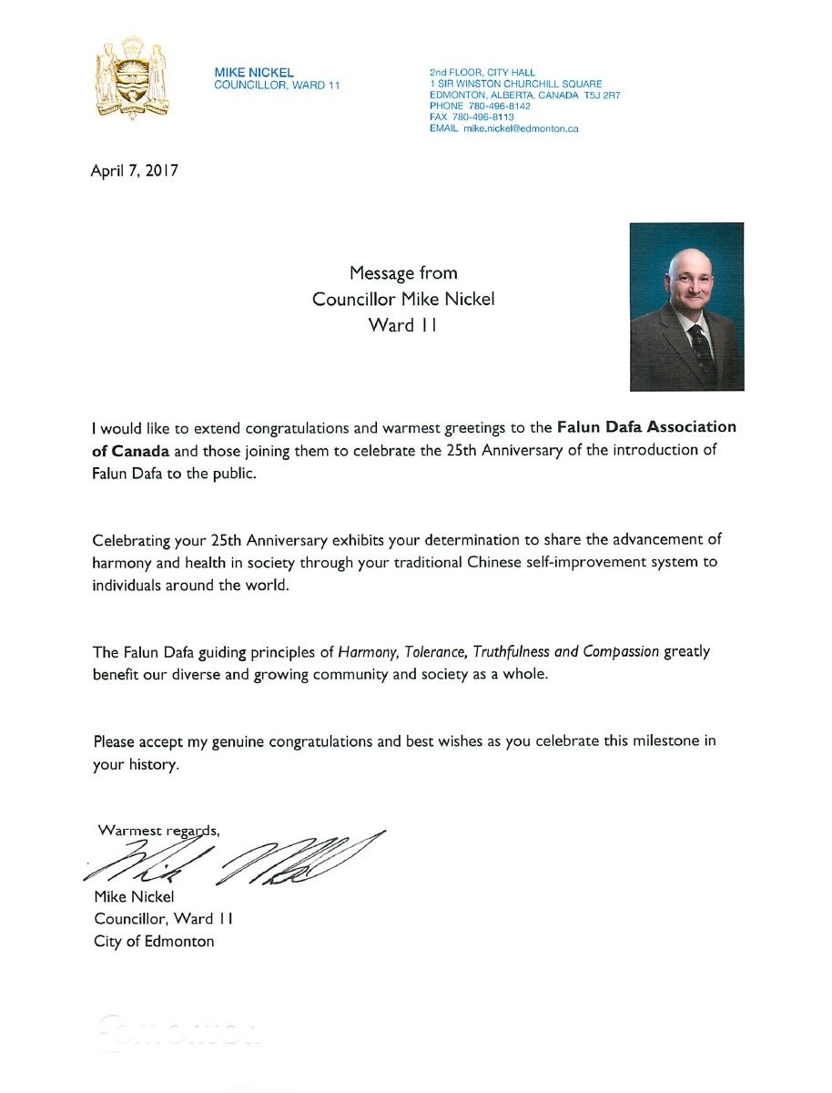 市议员Mike Nickel在贺信中表示,“法轮大法的指导原则对我们多元的、成长中的社区与社会整体有极大的益处。”