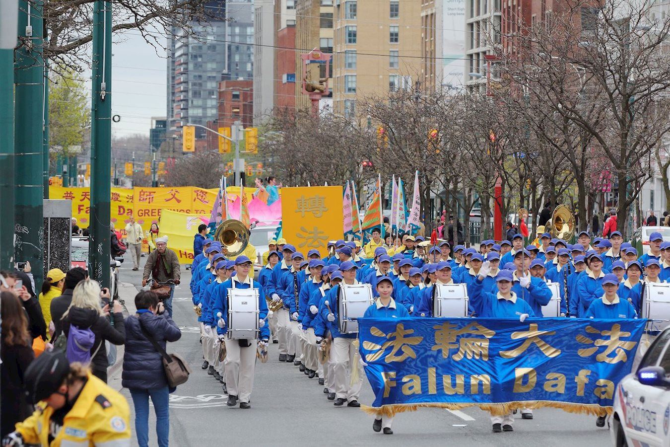 ![]() 图2~16:五月六日中午12点40分开始,多伦多法轮功学员在市中心举行庆祝法轮大法洪传世界25周年大游行。 |