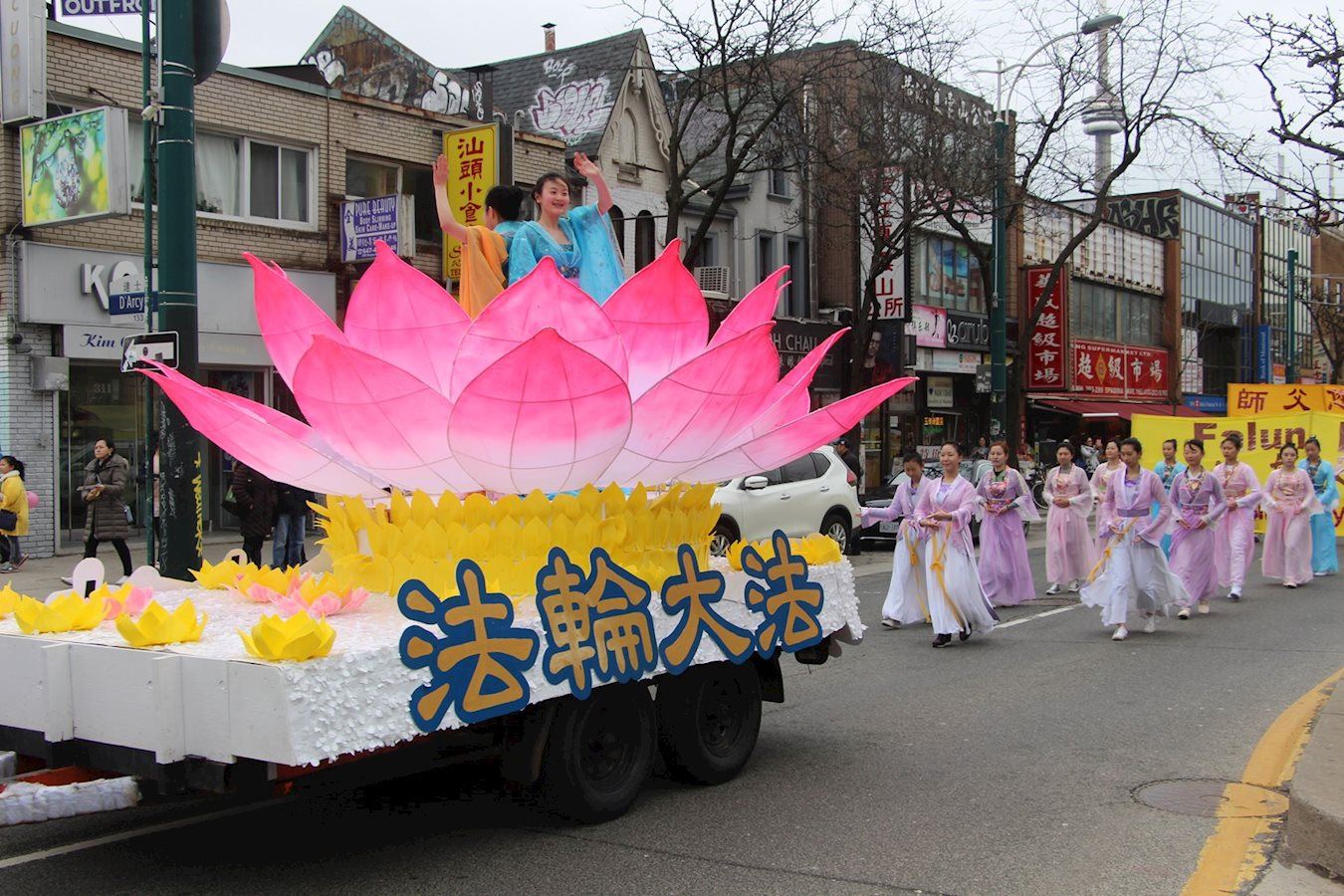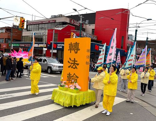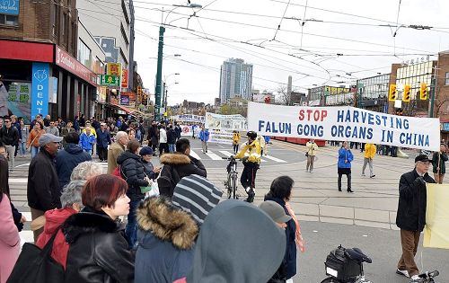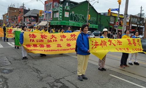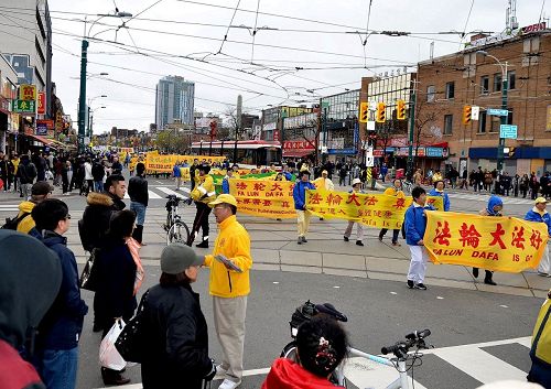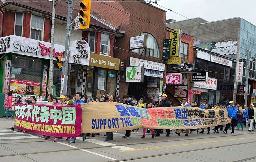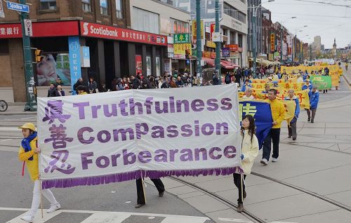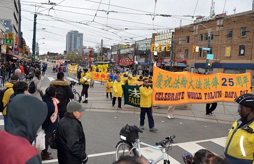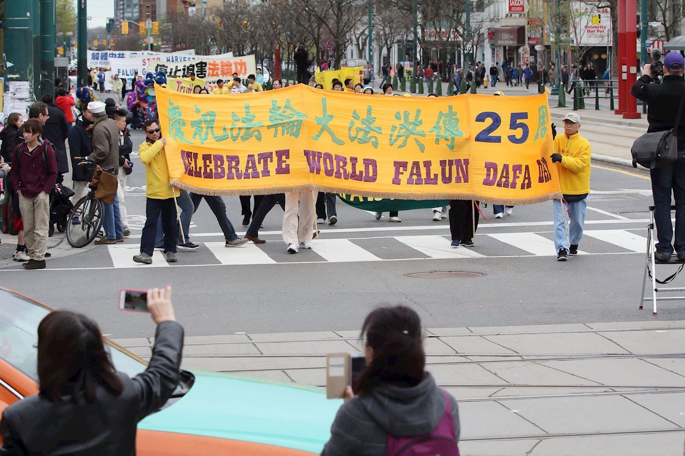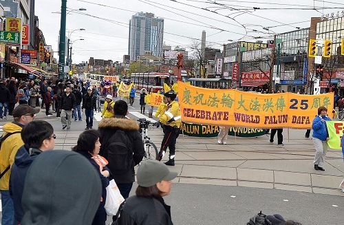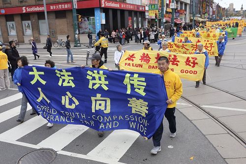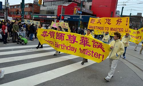在游行出发前,拍了集体照和录像,恭祝李洪志师父生日快乐!中午12点40分开始游行,游行绕着多伦多市中心经过唐人街两次,最后回到起点。沿途得到市民的欢迎和支持,有了解法轮功真相的西人表示敬佩和支持;有了解真相后的华人做了“三:退.”。