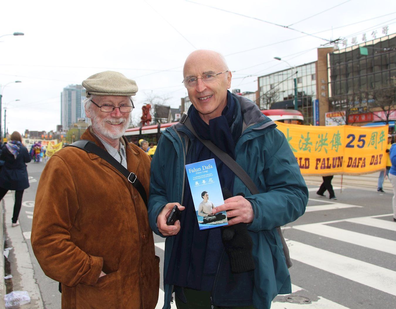多伦多居民Patrick Gallagher和朋友Giles跟法轮功学员索取了资料说:“请给我们资料,我们想了解更多。我知道法轮功一些情况,知道他们在中国大陆是受迫害的,今天看了这个这么美好和壮观的游行,我真不知道怎么说:为什么相信这么美好的东西的人会受到迫害?!我真很佩服他们(法轮功学员),他们一直坚持着反迫害。我一定支持他们!”
