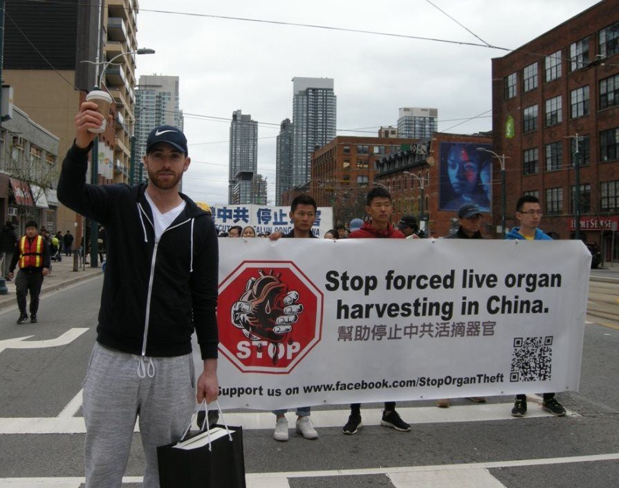 来自英国电工师Keith Johnson和他的女友Rubie Morsy一起观看游行。Morsy女士说:“我很喜欢法轮大法的真善忍法理。”当了解到法轮功学员在中国被中共迫害并被活摘器官时,Morsy女士说:“发生在中国的中共对法轮功学员的迫害太可怕了!中共应该立即停止迫害法轮功!”Johnson先生说:“法轮功学员被关进监狱并被活摘器官这太不公平了!”然后Johnson先生就大声喊起了口号“停止活摘法轮功学员器官!停止活摘法轮功学员器官!(Stop organ harvesting! Stop organ harvesting!)” Johnson先生并举起了手中的咖啡杯,恭恭敬敬地高举过头对走过来的每一个游行方阵示尊敬和敬酒状,最后干脆走到“停止活摘”方阵前对法轮功学员举杯表示敬意并留影。