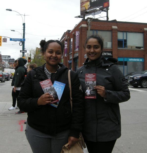 ![]() 图5:多伦多居民Patrick Gallagher(左)和朋友Giles跟法轮功学员索取了资料说:“请给我们资料,我们想了解更多。” |