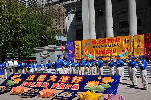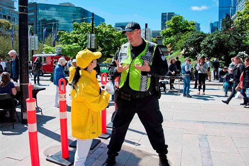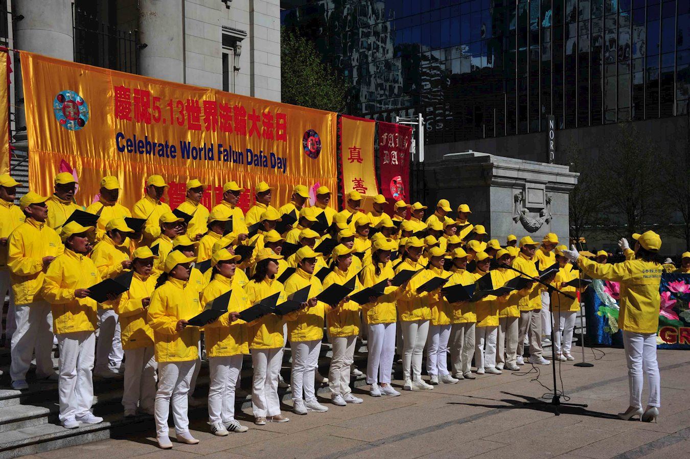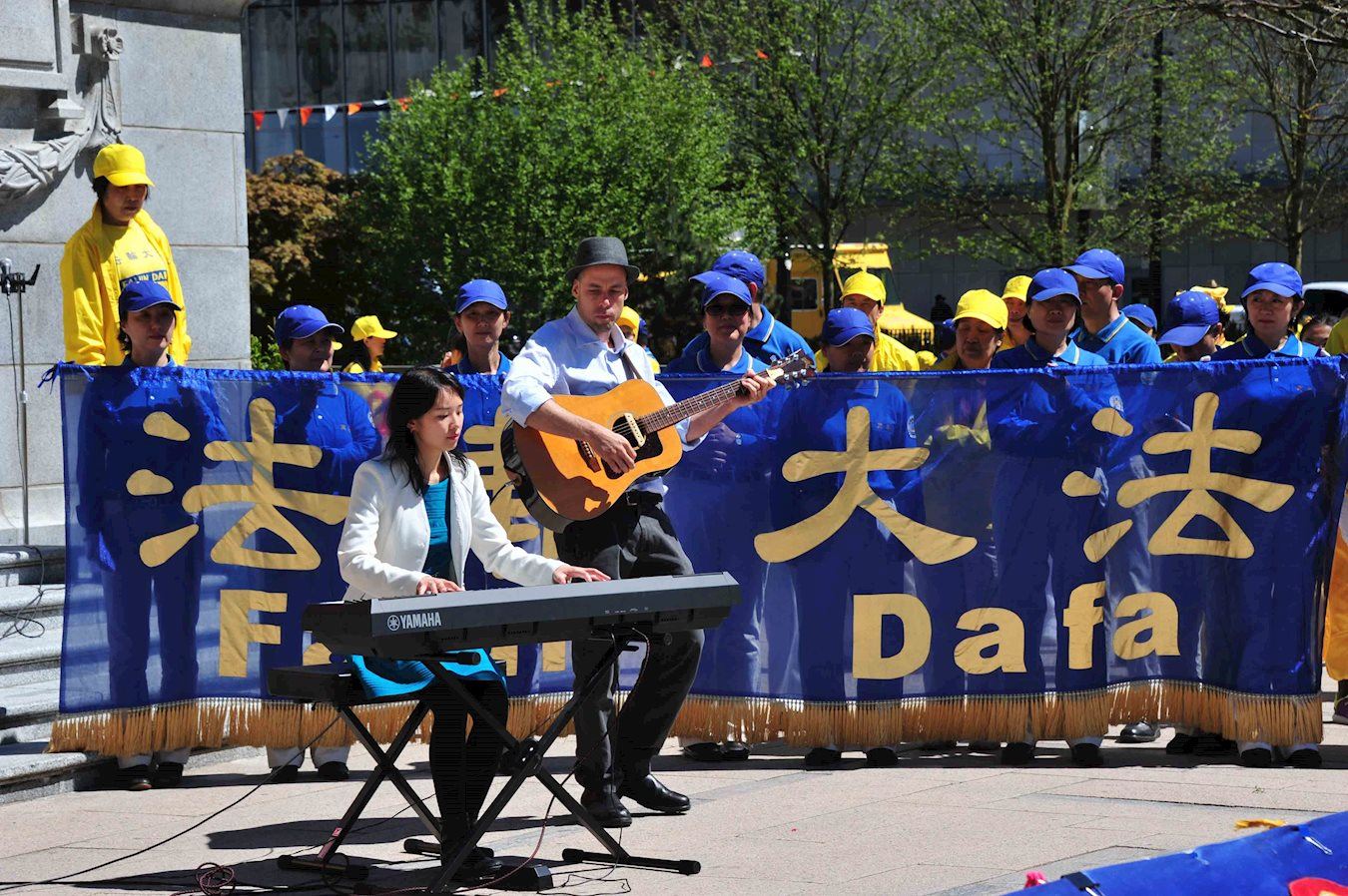 五月六日,温哥华天气宜人,法轮大法学员的庆祝活动丰富多彩,有器乐表演,独唱,天国乐团演奏,腰鼓队表演,法轮功功法演示,大法小弟子表演,合唱等等。庆祝活动位于繁华的市中心的艺术馆前,很多过往的行人被丰富多彩的庆祝活动所吸引,纷纷停下来观看表演,并询问法轮功的更多信息,签名支持法轮功学员反迫害,很多行人还纷纷拍照留影,很多市民表示法轮大法日是个伟大的日子。