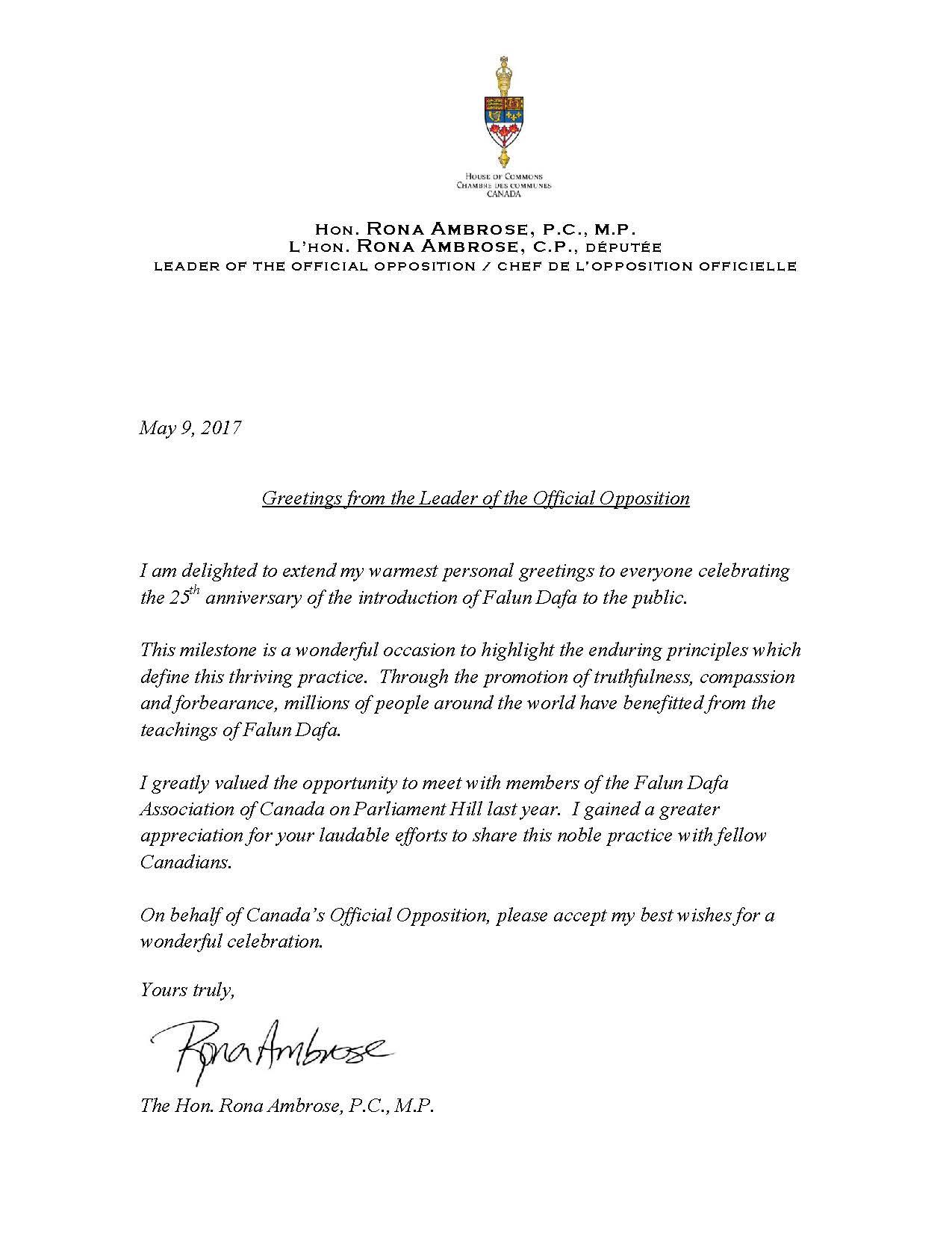 加拿大反对党领袖Rona Ambrose代表反对党(保守党)发来贺信“为美好的庆祝活动所送上最好的祝福”,感谢法轮大法学员们“与加拿大同胞分享这一高德大法所做出的值得称赞的努力”,并表示珍惜自己过去与法轮功学员们会面的机会。