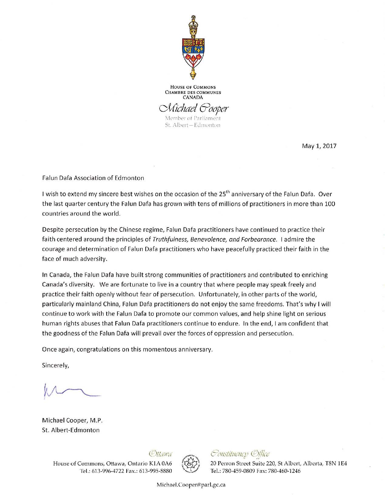 作为埃德蒙顿西区的国会议员,值此法轮大法洪传二十五周年之际,我希望表达我的祝愿。