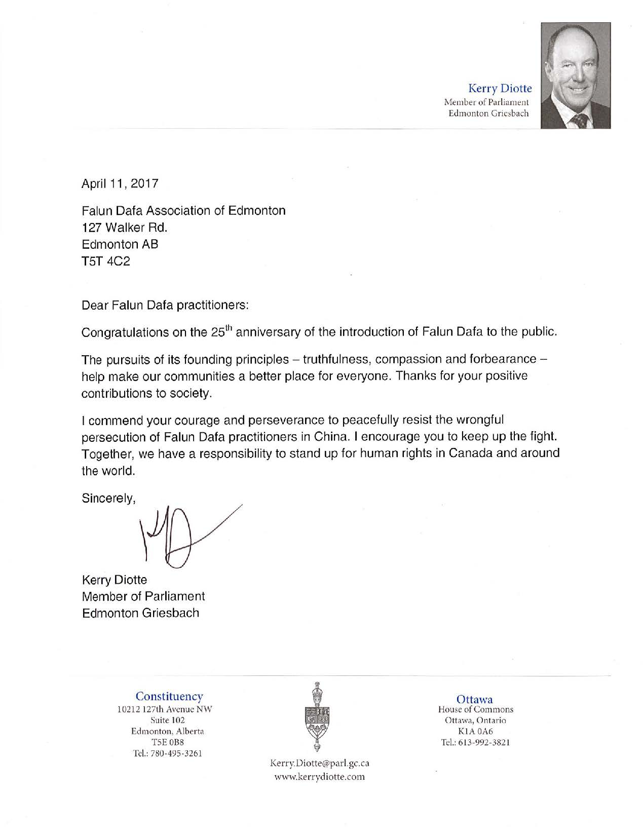 国会议员凯瑞·迪奥特的贺(Kerry Diotte)在贺信中赞扬法轮大法对“社会的积极贡献”,以及法轮大法学员在抵制中共的“非法迫害”所表现出的“勇气和毅力”。