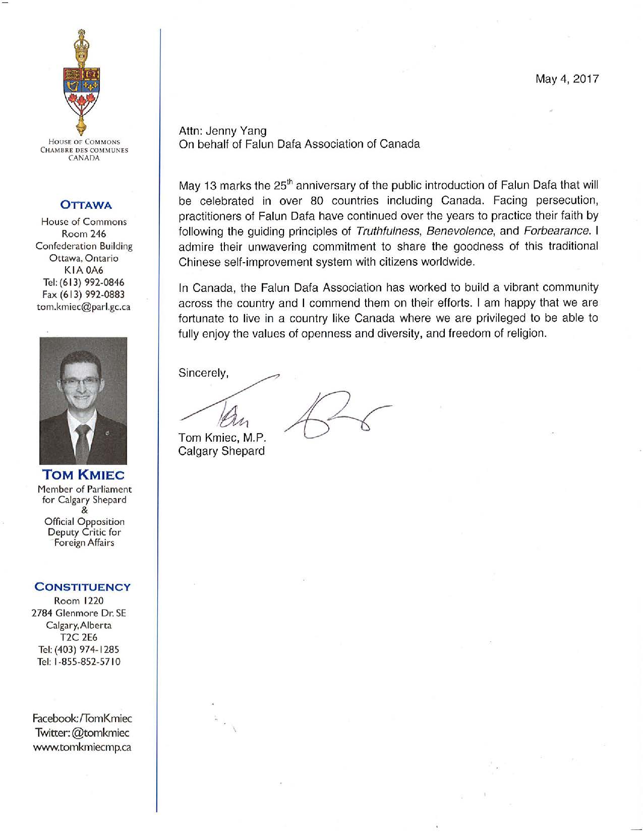 卡尔加里Shepard区国会议员汤姆·凯西克(Tom Kmiec)在贺信中赞美法轮大法学员面对迫害,多年来坚持不懈的按照“真、善、忍”的指导原则修炼。