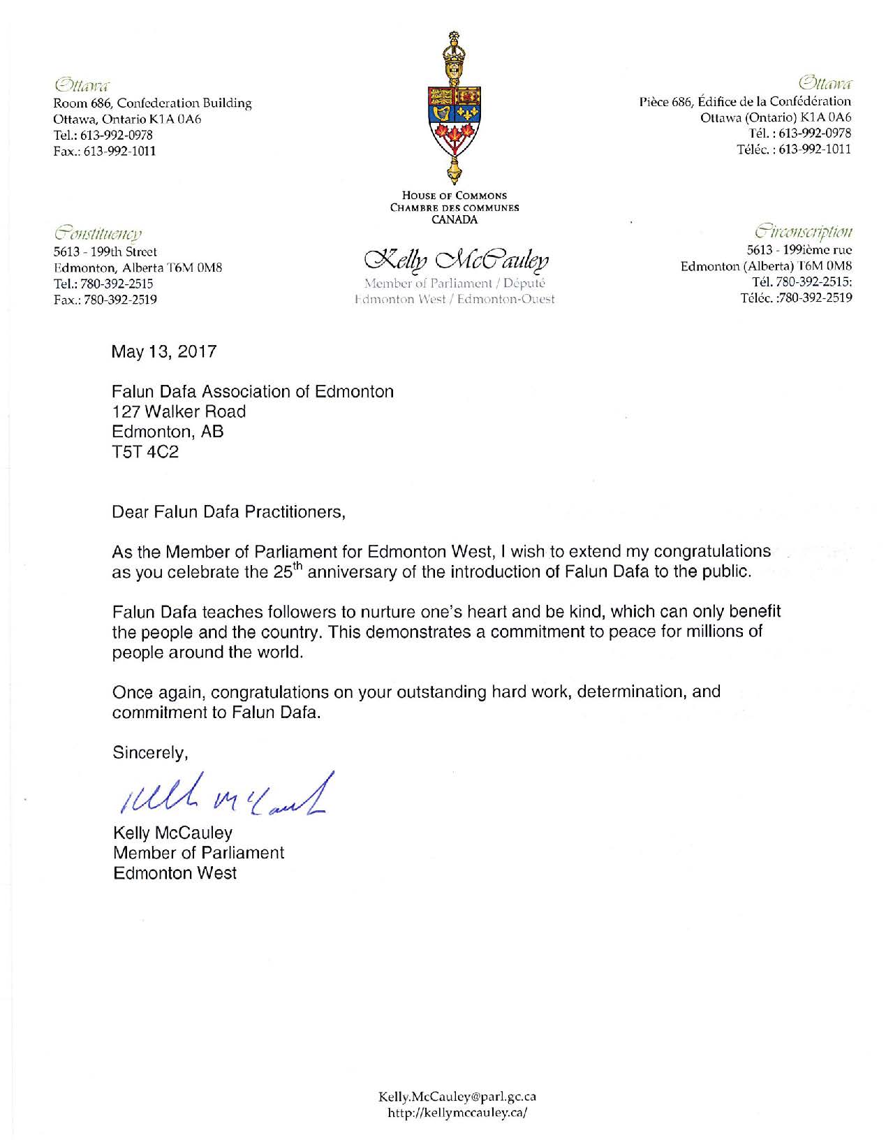 埃德蒙顿西区国会议员凯莉·麦考利(Kelly McCauley)在贺信中赞美法轮大法教导人修心,做好人,造福于国家与人民。