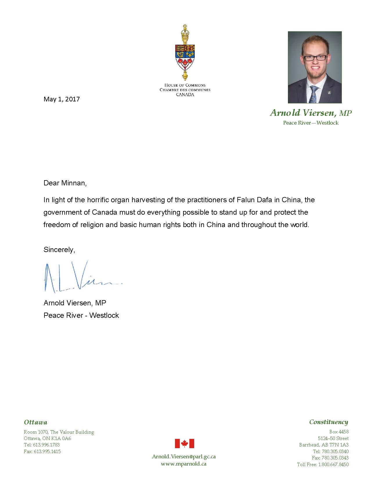 Peace River - Westlock国会议员阿诺德·维森(Arnold Viersen)在贺信中表示:关于发生在中国法轮大法学员身上的可怕的活摘器官(的罪行),加拿大政府必须尽一切可能捍卫和保护中国及世界的宗教自由与基本人权。