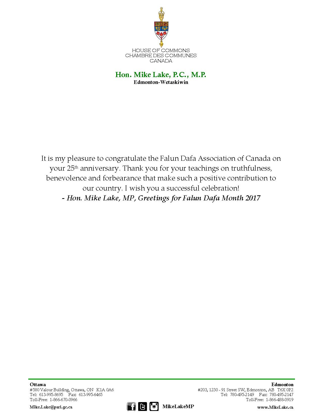 国会议员麦克·湖(Mike Lake)在贺信中说:能够祝贺加拿大法轮大法协会庆祝法轮大法洪传二十五周年是我的荣幸谢谢。“真、善、忍“的教导对国家做出的如此积极的贡献。祝你们的庆祝活动成功!