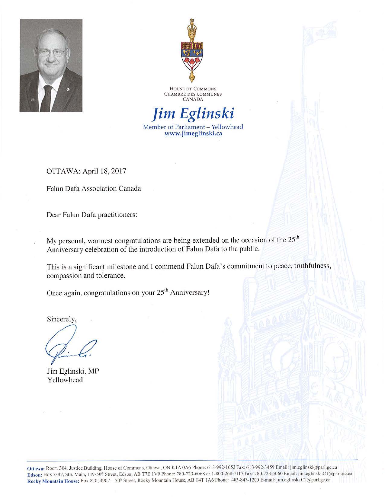 国会议员吉姆·埃林斯基(Jim Eglinski)在贺信中说:亲爱的法轮大法修炼者们,我个人对法轮大法洪传二十五周年致以最诚挚的祝贺。这是一个重要的里程碑。我赞美法轮大法对和平,对真、善、忍的坚持。再一次,祝贺你们的二十五周年纪念日。