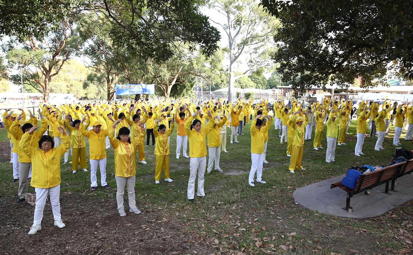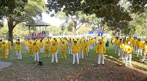 当天早上九点,法轮功学员便以在近市区的坎珀堂(Camperdown)公园集体炼功的形式,揭开了庆祝活动的序幕。数百名身着黄色上衣的法轮功学员,在温暖的晨光下,随着祥和的炼功音乐,整齐地开始了缓慢圆的炼功。附近的居民看到的炼功场面都停下脚步观看。