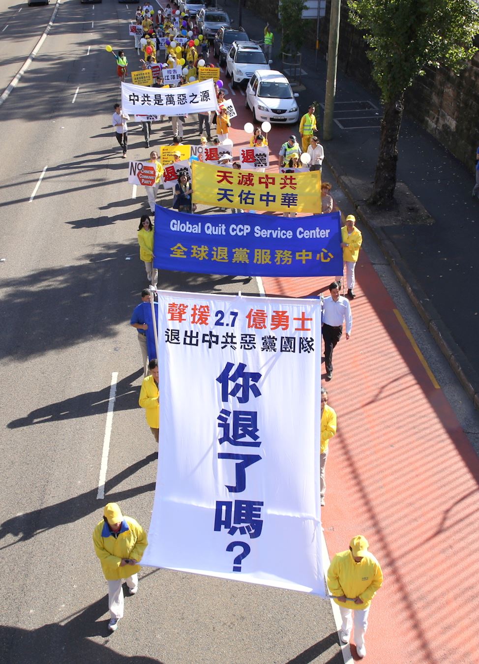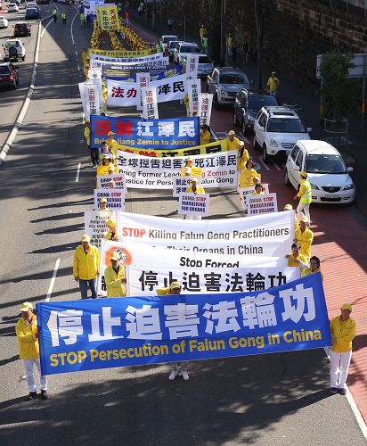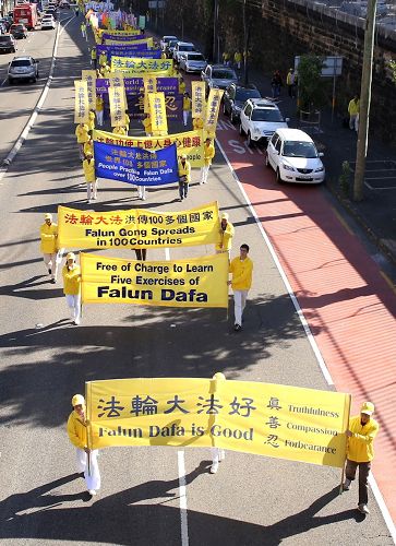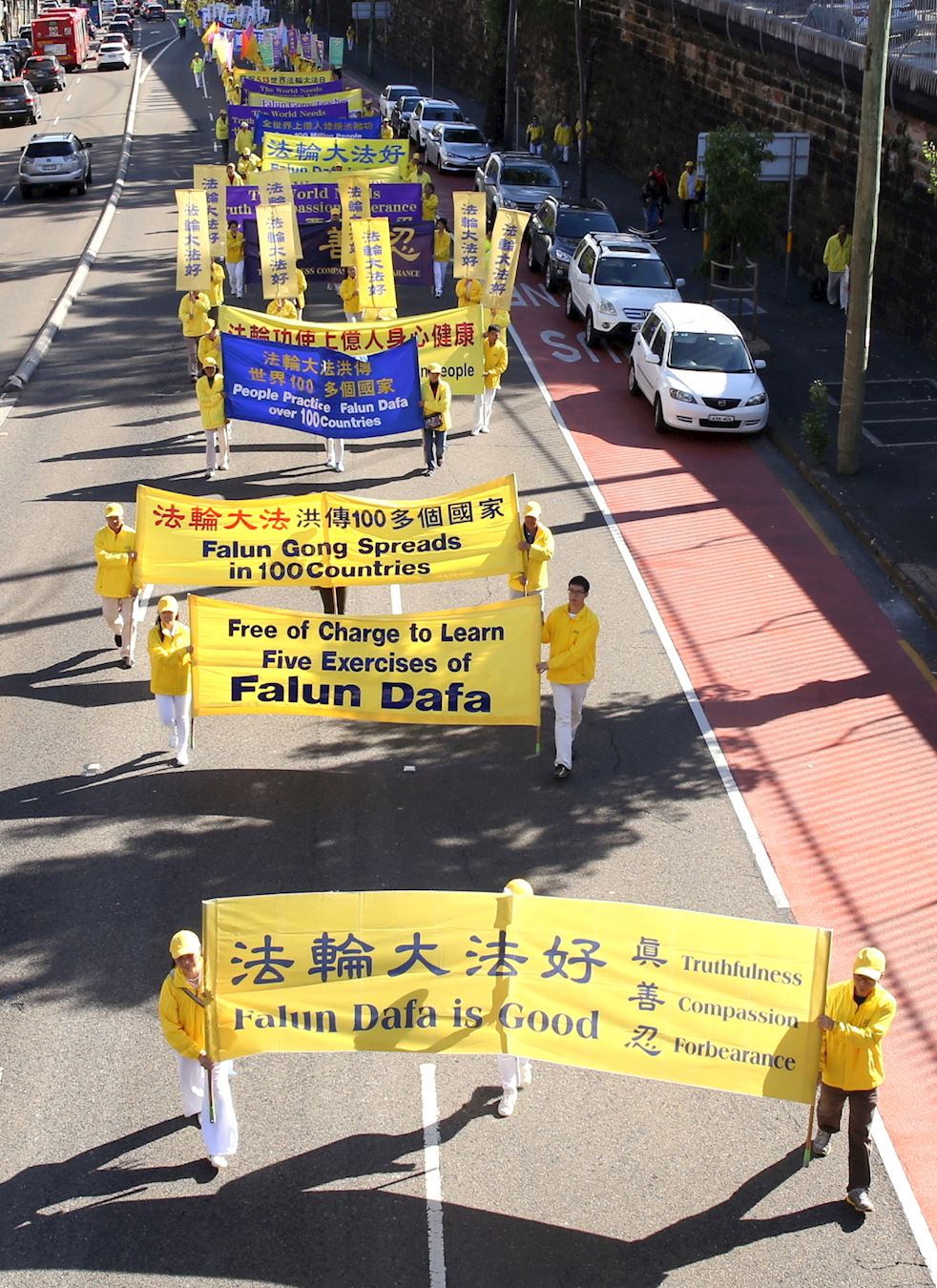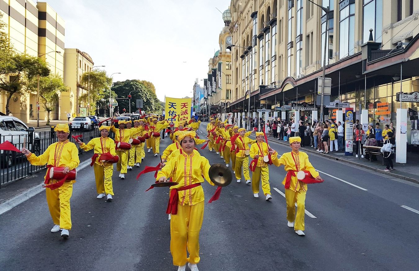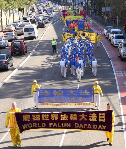 下午一点,法轮功学员的游行队伍以天国乐团演奏“法轮大法好”乐曲演奏开道,从公园出发,环绕中领馆一周,走上主街Parramatta路,经过悉尼大学和著名的百老汇商业区,到达市中心的贝尔莫尔公园。一路吸引了众多的民众观看。