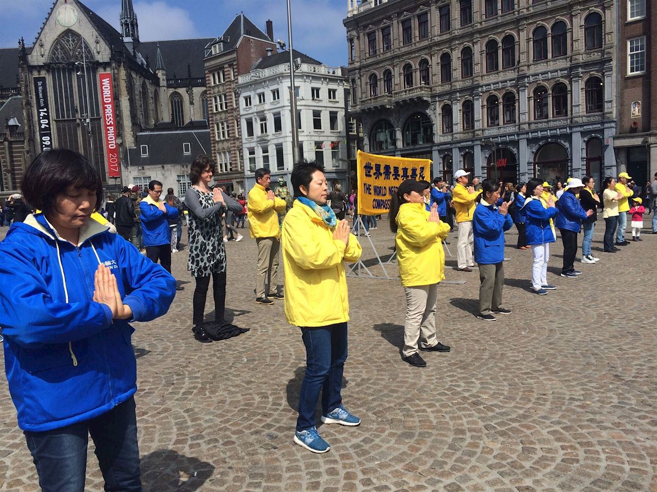 【明慧网二零一七年五月九日】每年的五月十三日是世界法轮大法日,今年的“五一三”是法轮大法洪传世界二十五周年的日子。为欢庆这殊胜的节日,法轮功学员来到了荷兰最著名的景点之一——达姆广场,与来自世界各地的游客共享法轮大法的美好,同时也不忘提醒人们关注在中国大陆已持续十八年之久对法轮功的迫害