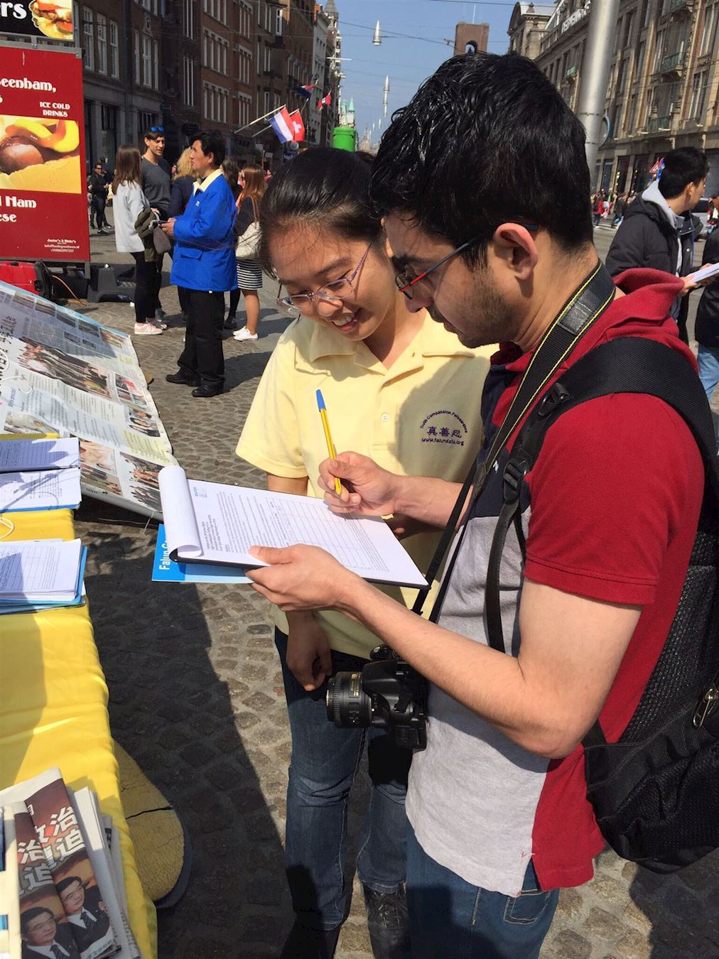 达姆广场的游客中有很多来自大陆的华人,由于受中共的造假宣传欺骗,很多人对法轮功有误解,看到海外有这么多人在炼法轮功,而且是公开的,有一些人带着好奇走上前来观看炼功场面或阅读真相展板上的内容,通过学员带着善意的解释,他们大部份人对法轮功表示认可或支持。