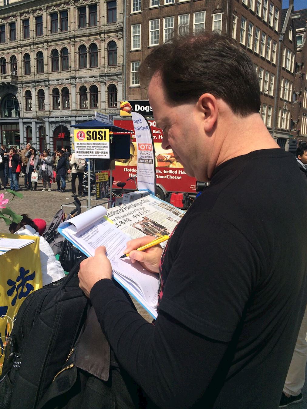 三位来自荷兰的年轻女性向学员询问什么是法轮功,以及中国政府为什么要迫害法轮功。听到学员的介绍后她们都很气愤,马上在征签簿上签了字,其中一位说;“这太不应该了,这么好的理念—真、善、忍,对身体又这么好,有什么不对?!”“为什么要迫害,简直太荒唐了!”
