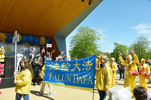 游行路线从Parventa的主要街道,最后到达儿童梦幻公园。游行方阵前,学员们手持蓝色“法轮大法”横幅,当法轮功的方阵走过主席台,文茨皮尔市主席宣布:“法轮大法万岁!(Long live Falun Dafa!)”