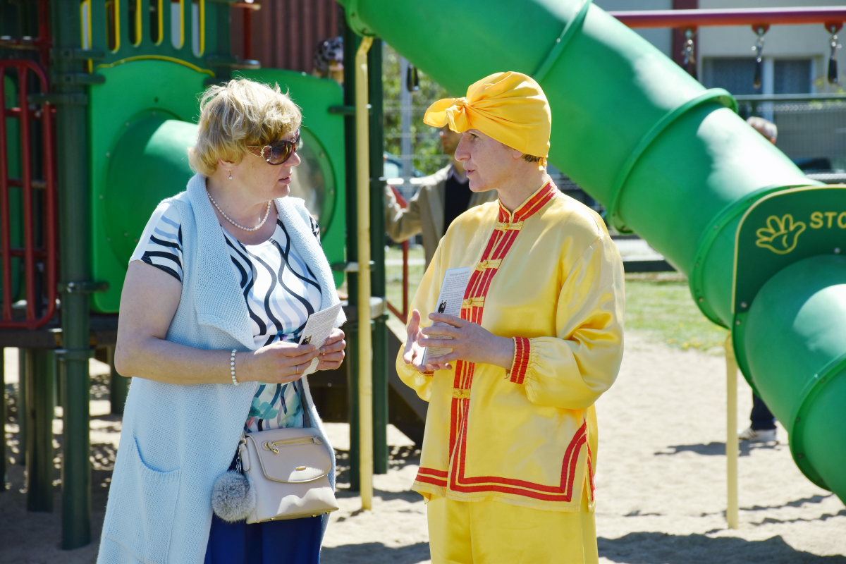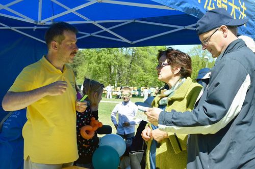 许多人对文茨皮尔斯市的法轮功炼功点很感兴趣,法轮功学员回答了很多人们的问题。