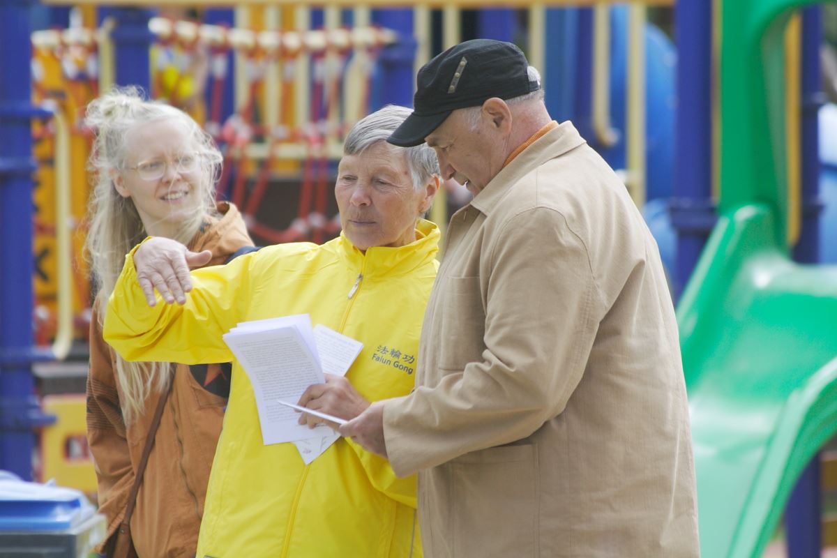 一名路人表示自己对炼功和打坐很感兴趣,可是就是静不下来,他询问法轮功是否可以帮助他应付压力和忧虑。一位学员告诉他:“法轮功是一种循序渐进,提高自我心性的修炼,刚开始时,我们对金钱,不公平等有很多想法,我们不能冷静下来。但是当我们开始修炼时,我们开始明白,生活中的一切都有原因,没有偶然的,随着修炼,我们的心灵逐渐平静下来,并在打坐中达到非常舒适的状态。”法轮功学员还向他讲述了迫害真相,他说:“我已经知道这场迫害,也知道中共对其他民族的迫害。”他表示很高兴能够签名,表达他的立场,呼吁法办江泽民,结束迫害。