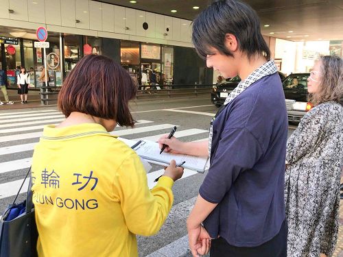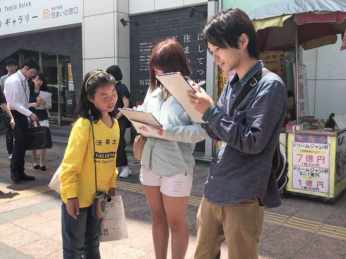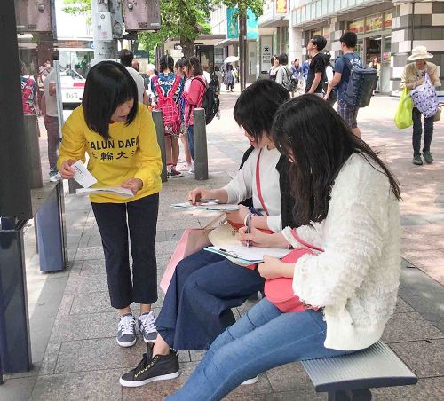 福冈某所大学的有位女大学生,看完联署说明文之后马上在“刑事举报书”上签名并说:“对法轮功我有那么一点点的了解,但并没有太深的理解。今天这个机会很难得,能不能仔细地讲给我听呢?”原来这位女大学生的男友是中国人,曾经她的男友跟她提起过法轮功被迫害的事情,听完学员的真相说明后她表示感谢说:“希望这场迫害早日结束,我把今天所听到的真相传达给我的男友,希望他也了解事实真相。你们加油吧!”