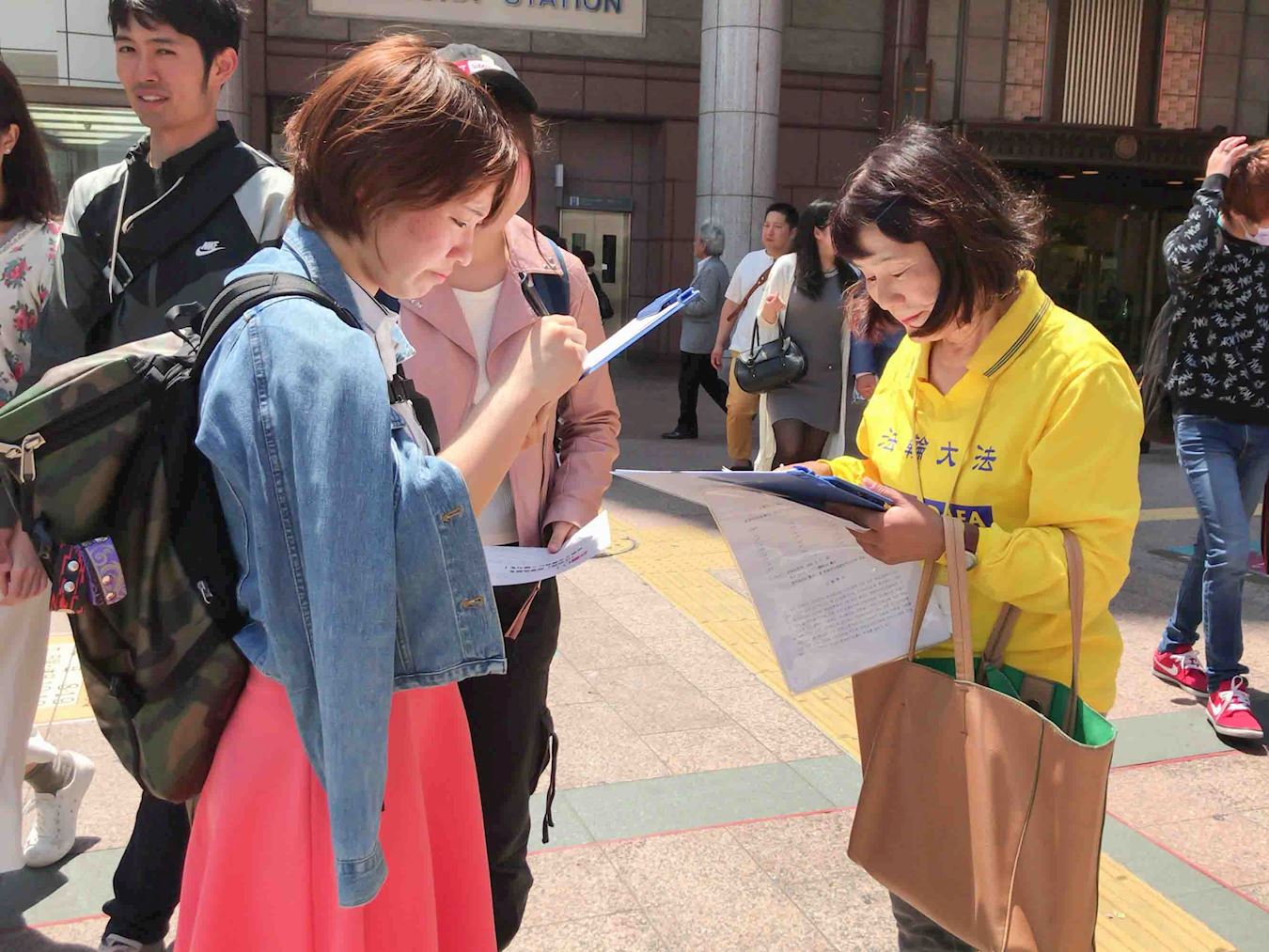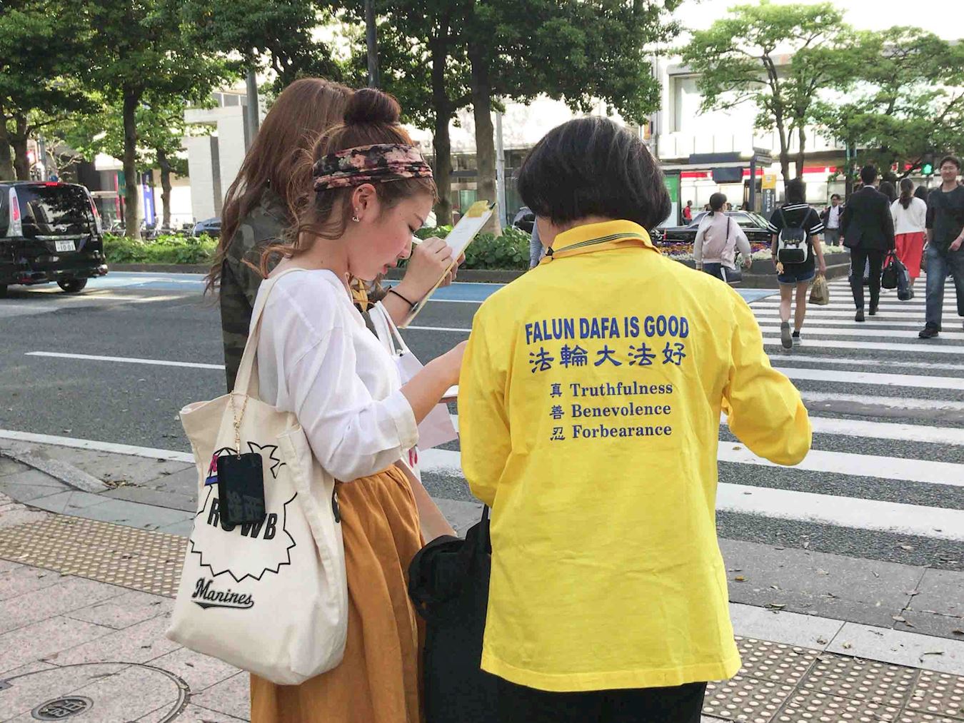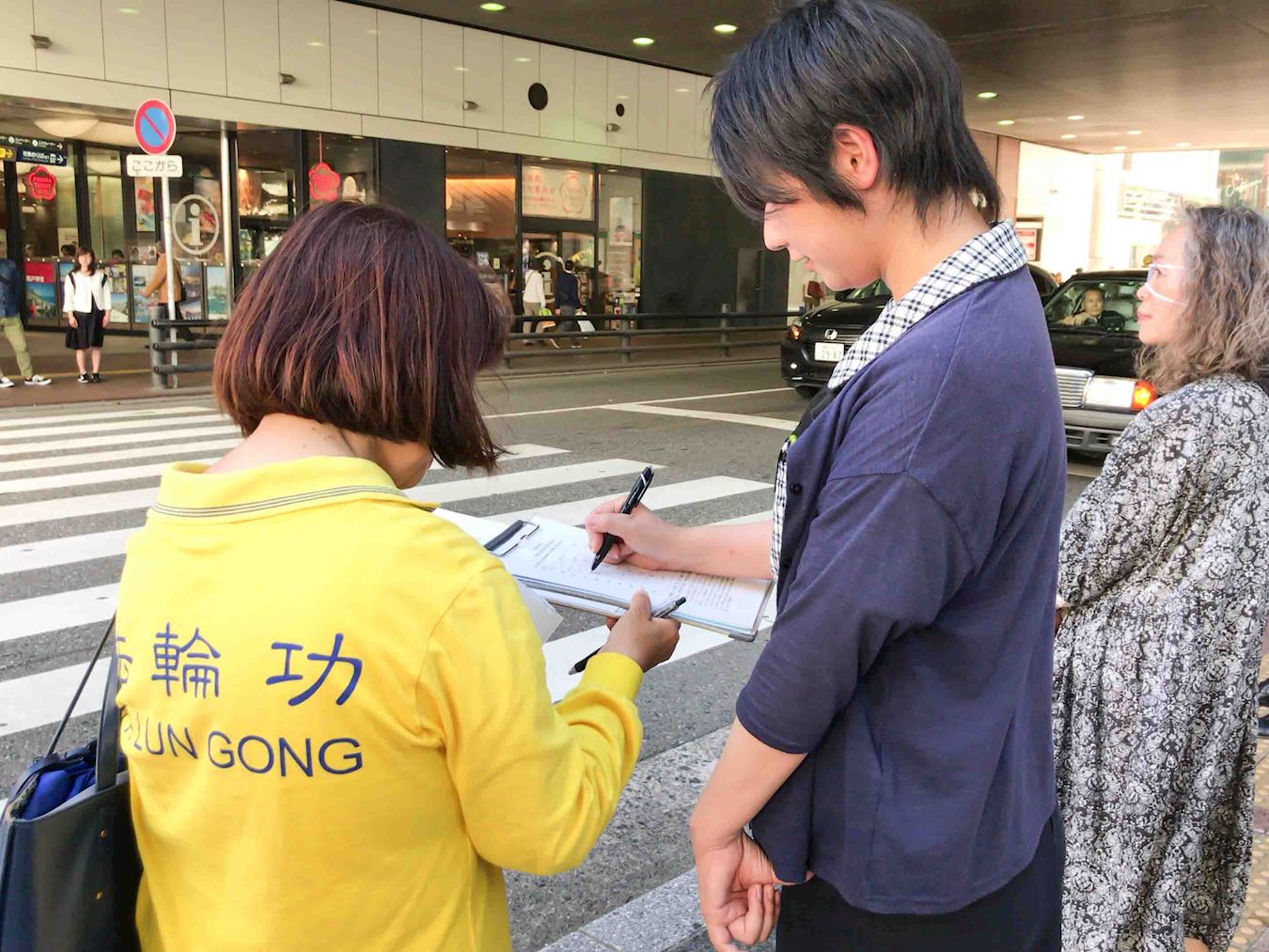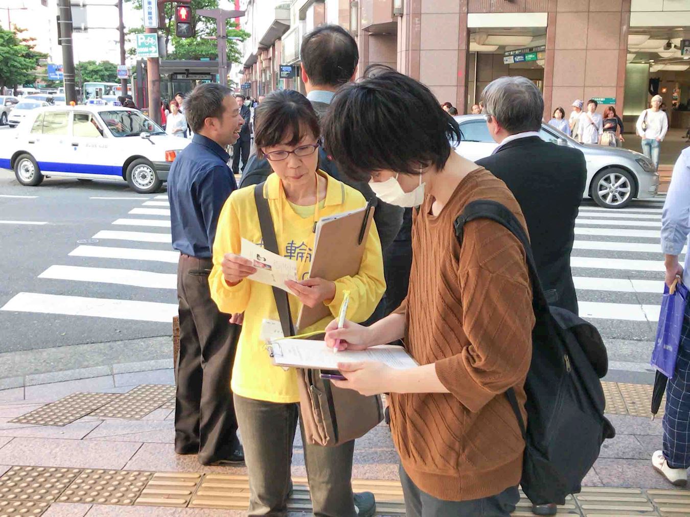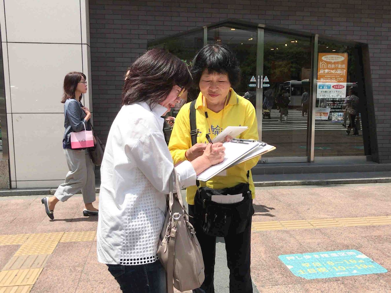 到下午在福冈天神的繁华街的征签活动点的学员,听到呼叫声便回头一看,又是这位大学生对学员微笑着说:“不久前我在您这里签过名了。今天我把我母亲也领来了,她很想签名。所以今天一定要让我母亲也签名吧。”女孩子的母亲向前靠一步对学员说:“我要签名支持你们。”