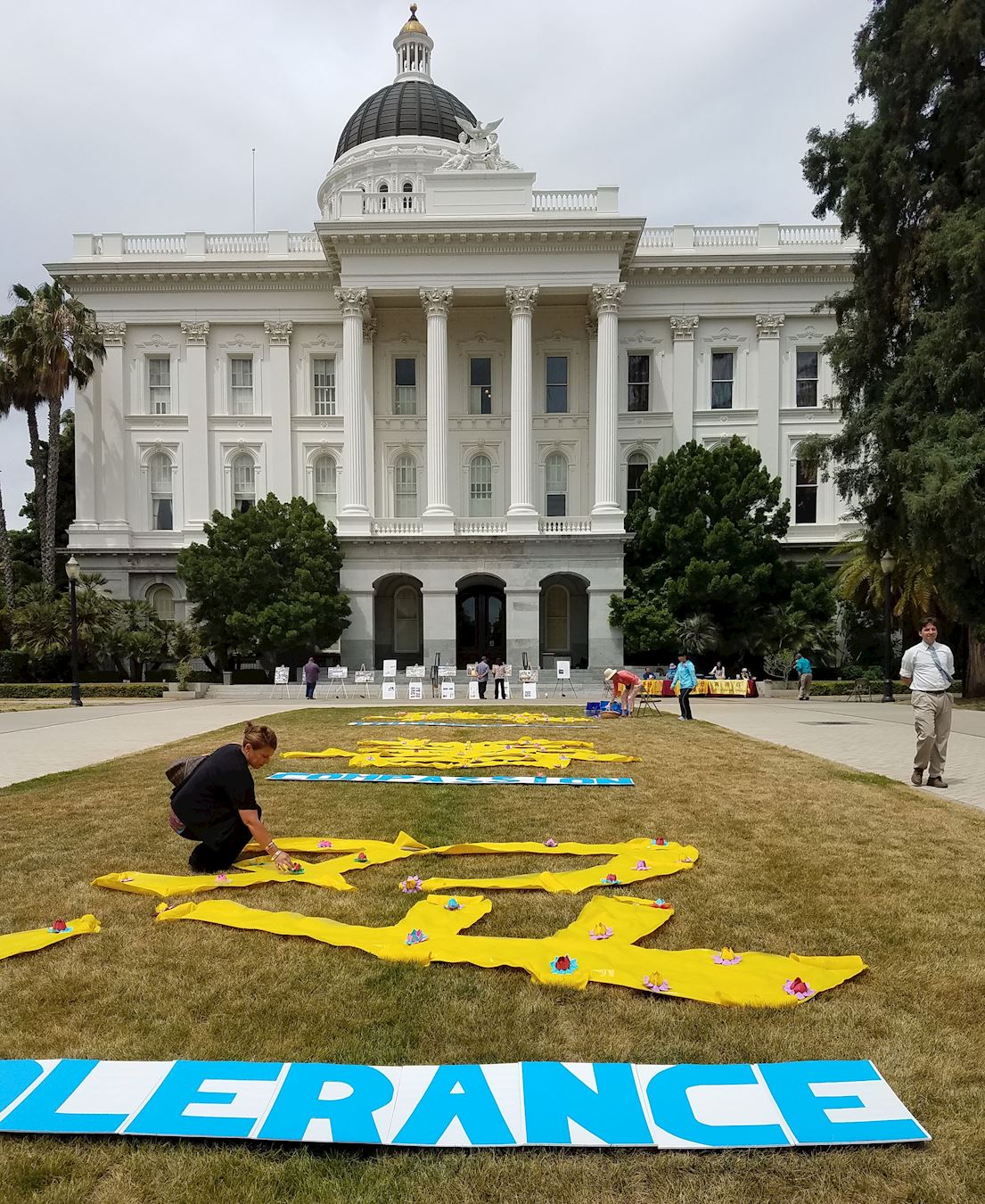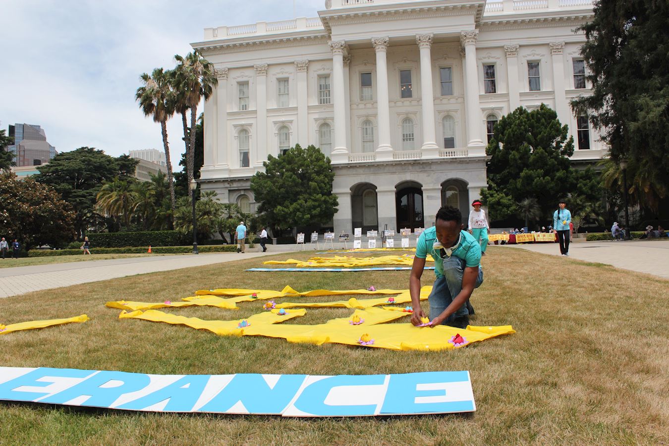 当天一早,法轮功学员们来到州政府大楼南门外的广场上,设置了介绍法轮功的真相图片展,并为民众发放法轮功的简介传单和法轮功学员们自己手工做的精美小莲花,还在草坪上摆放了“真善忍”三个大字,让民众把莲花放到三个字上,表达支持。