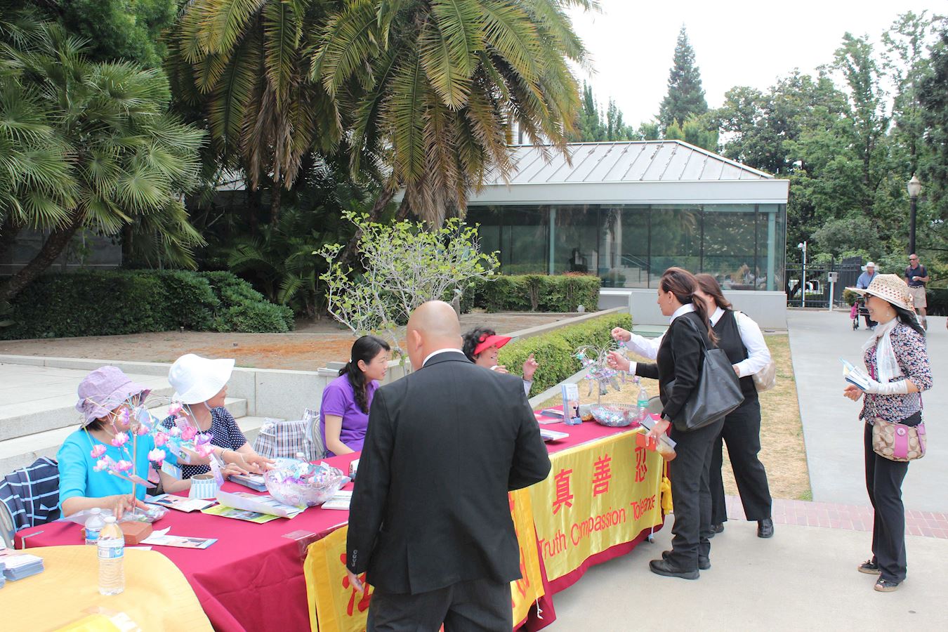 下午活动快结束时,一位在州政府大楼博物館工作的女士来到法轮功学员的桌子旁,说,“我五年前从你们这儿拿到了一朵小莲花,我现在还保存着。我特别喜歡这小莲花。”法轮功学员又给她了一朵小莲花,她非常高兴。她对法轮功学员的活动赞不绝口。还有很多游客和州政府及附近的工作人员与学员攀谈后,感谢法轮功学员来这里,让他们了解法轮功,知道了法轮功的美好。