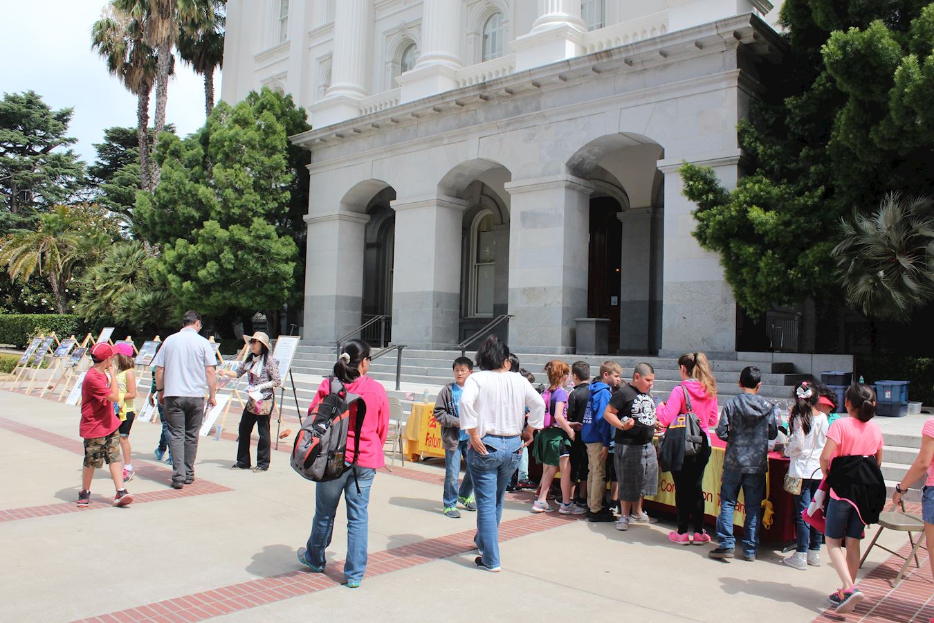![]() 图7~8:一批接一批前来参观州政府大楼的学生们驻足在真相桌前了解法轮功真相。 |