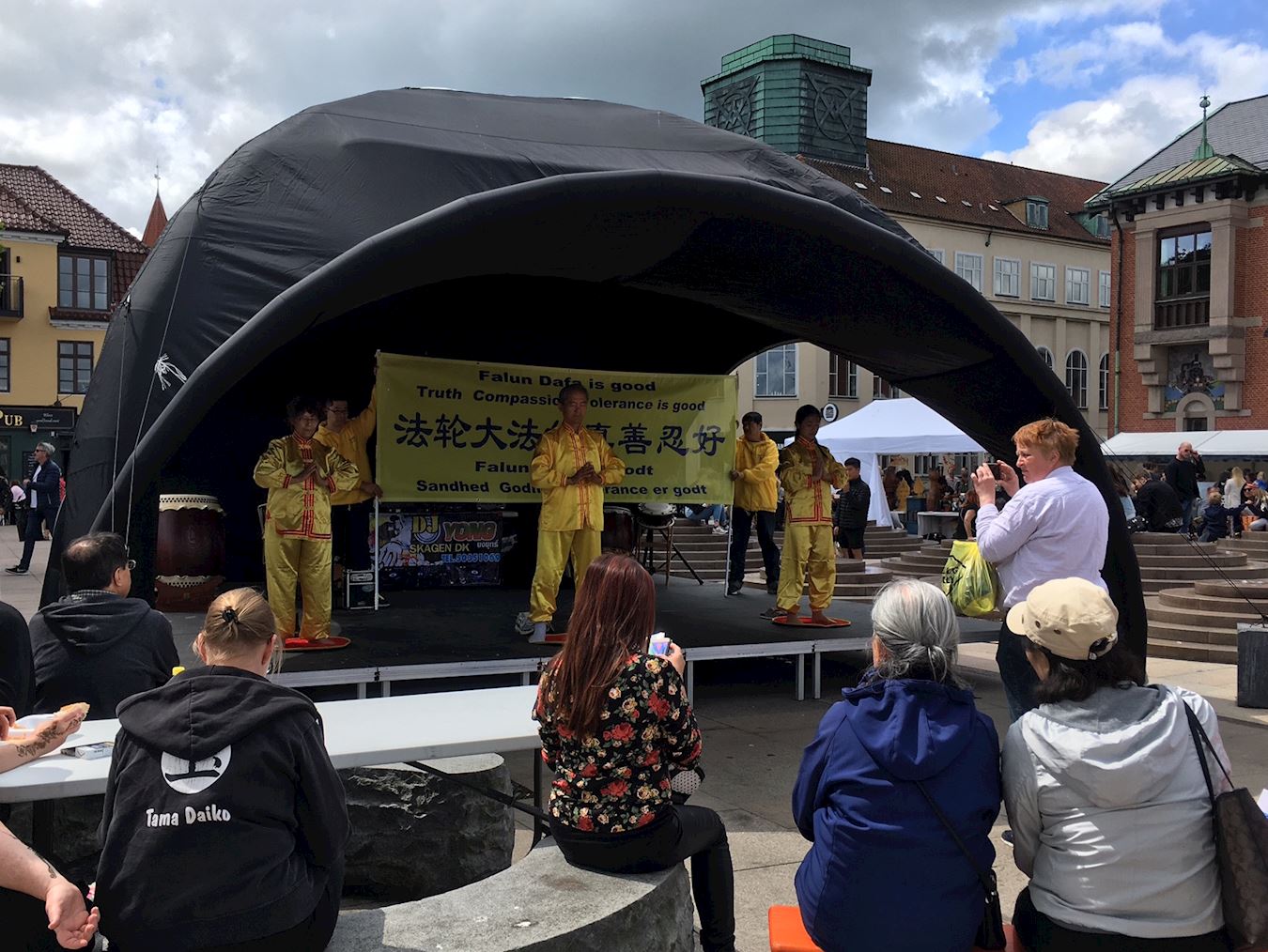 法轮功学员在舞台上两次展示优美的五套功法,在展示功法的同时,学员介绍五套功法的内涵。舞台前凳子上以及旁边的梯形小平台上坐满了人群,大家很高兴的接过法轮功简介和小莲花,人们在温暖喜悦的气氛中感受大法的祥和美好。