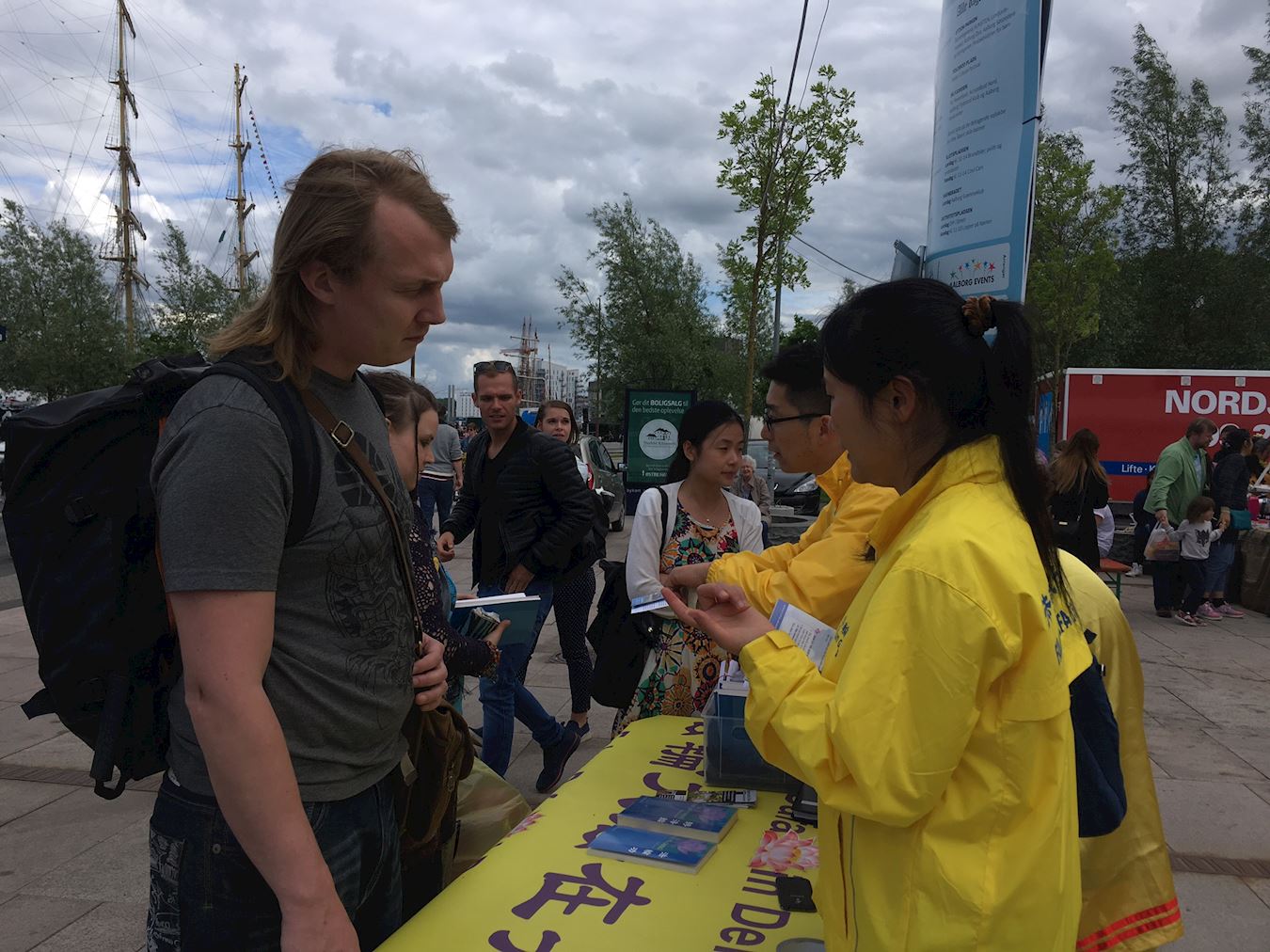 一位拉着行李箱等女士直奔法轮功的展位来,想买法轮功的书籍,她说:“我知道法轮功,我在网上看到有关法轮功的信息,我很喜欢上面介绍的法轮功在精神方面的教导,喜欢传统文化和修炼文化。”她打听哪里有炼功点,迫切的想学功。