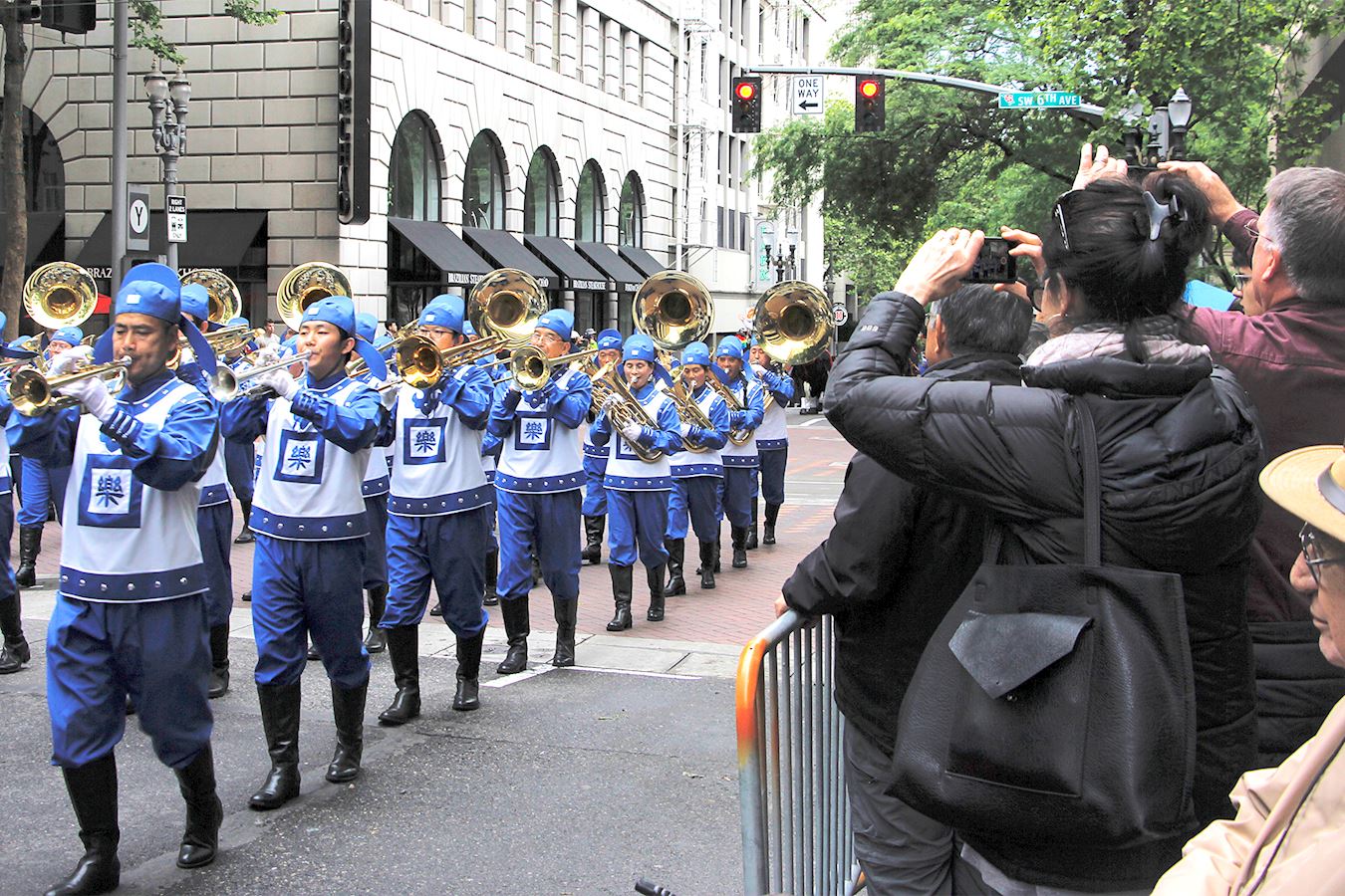 波特兰当地电视台KPTV对游行进行了现场直播,主人介绍说:“天国乐团与其它军乐队有很大不同,非常独特团员们身着汉唐古装,上面的文字‘乐’意思是音乐,太漂亮啦!”