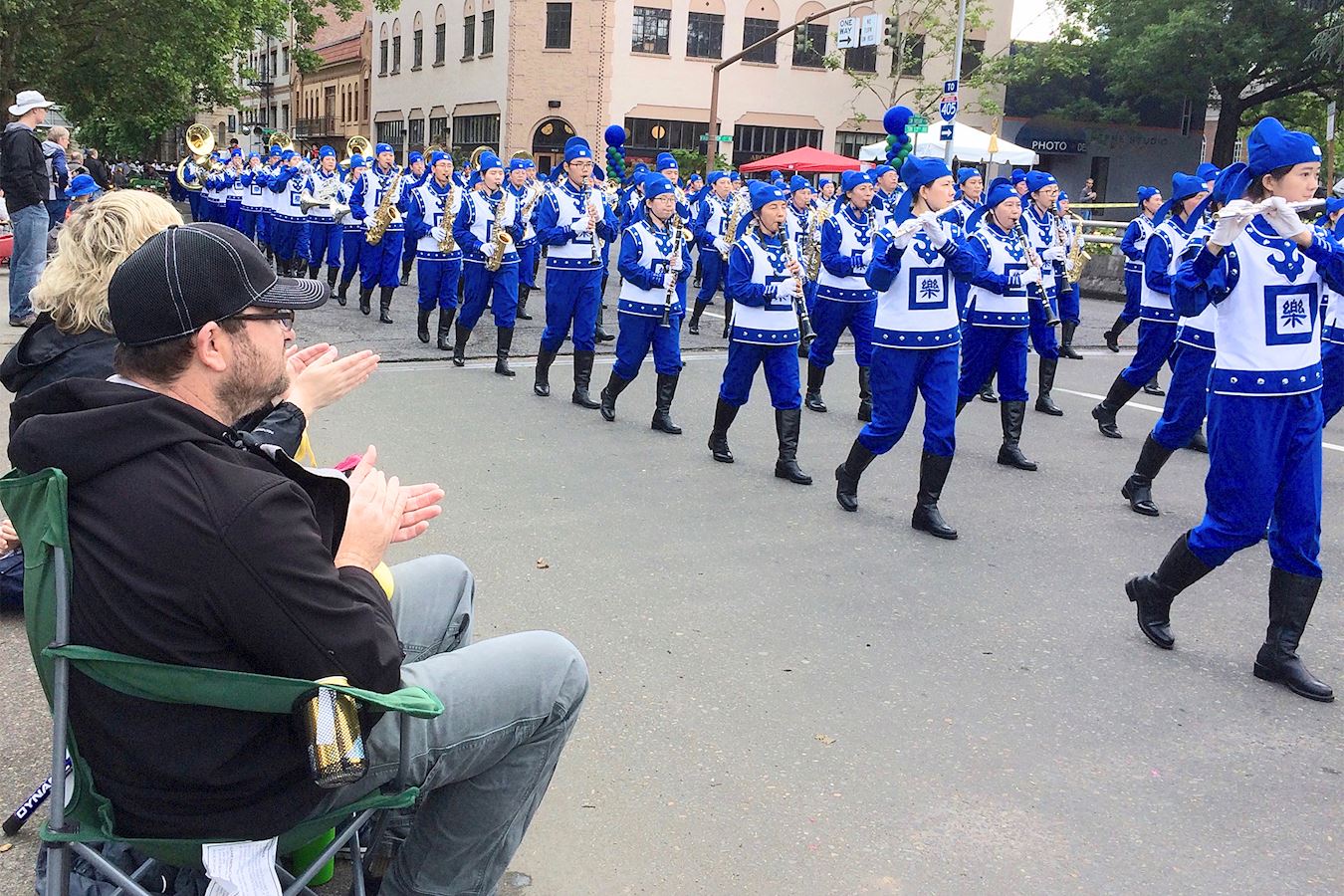 天国乐团所过之处,观众们有的鼓掌,有的竖起大拇指,有的起身双手合十表示敬意,有一位男士不时挥手大声说:“谢谢!谢谢!”几位中国人兴奋地指着天国乐团大声说:“快看法轮大法,太棒了!”