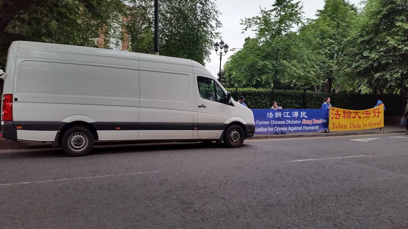 六月九日下午,中国代表团离开酒店之前,中共使馆调来两辆货车试图遮挡法轮功学员的横幅,了解情况后爱尔兰警方立即要求两辆货车离开,中共使馆的干扰企图都没有得逞。