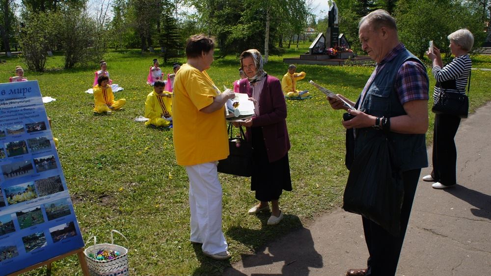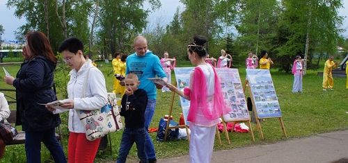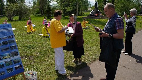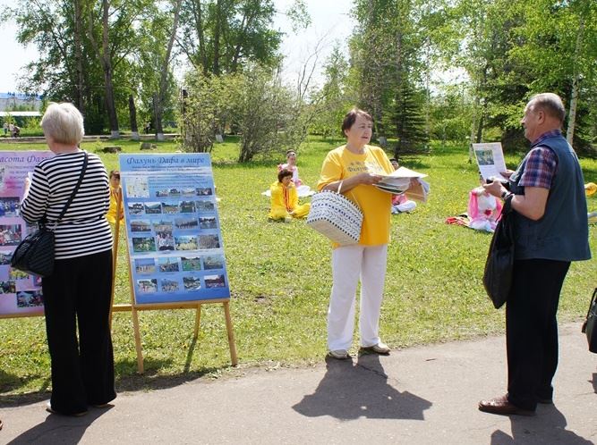 在位于市中心的城市公园的草坪上集体炼功,学员们祥和慈悲的炼功场景,吸引了行人驻足观看展板,接到真相资料详细阅读,向学员打听详细情况在哪可以学炼,并拍照留念。