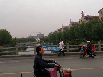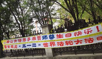 傍晚,在市政府旁设立的为庆祝城市日举办的歌舞晚会舞台上,主持人向民众们介绍了法轮功后,迎来了学员们表演的“法轮大法好”舞蹈,赢得了台下观众的热烈鼓掌。