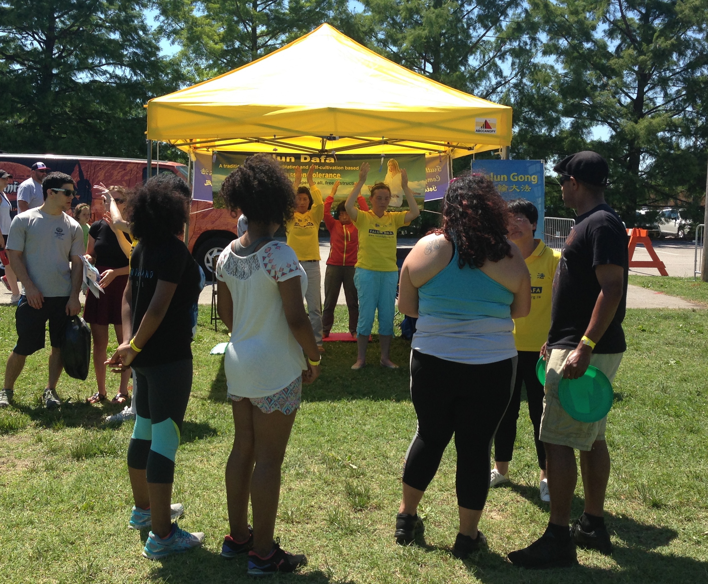 ![]() 图3:圣路易户外运动节上,游客学炼法轮功 |