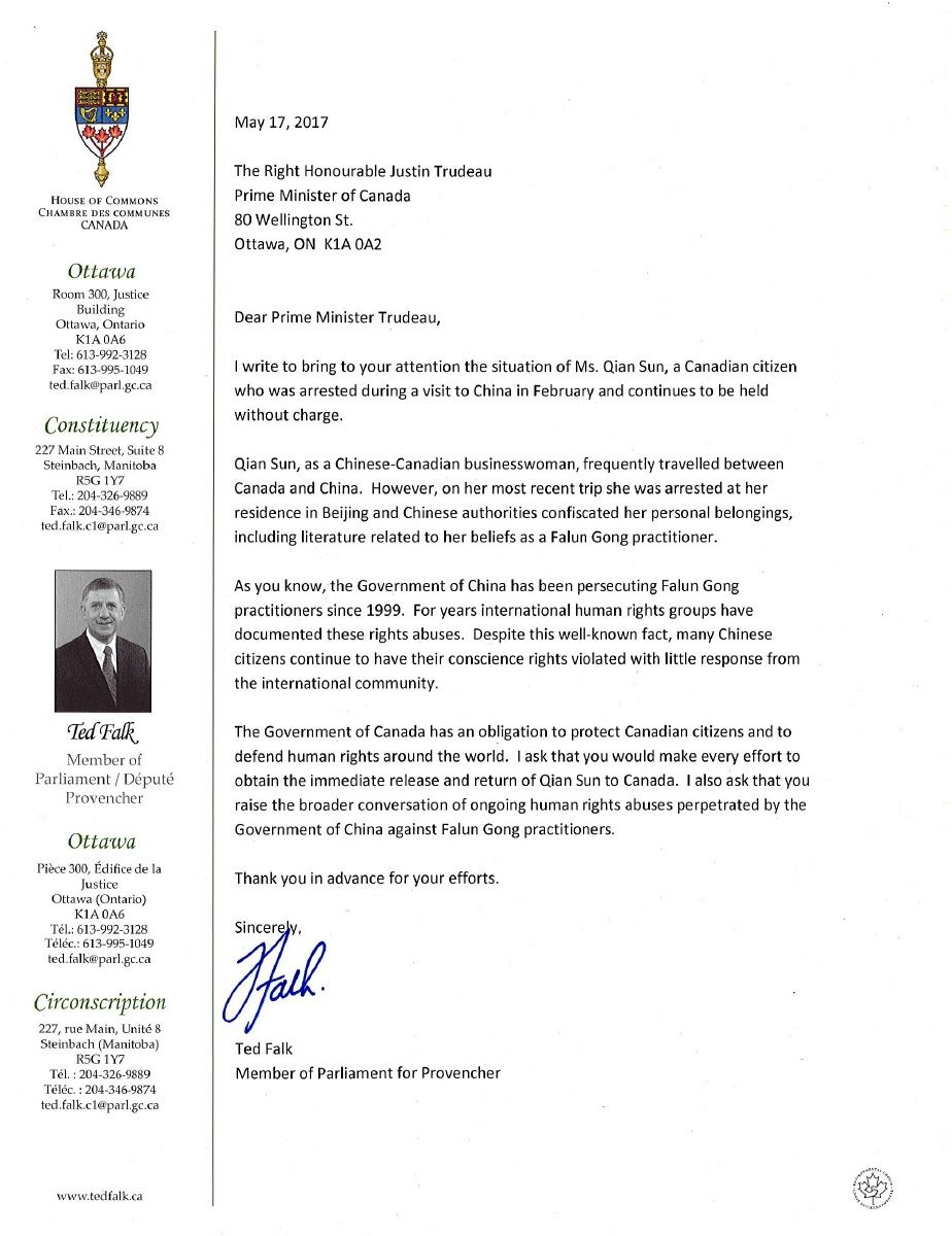 ![]() 加国会议员Ted Falk在给加拿大总理Justin Trudeau的信中提出对加拿大公民孙茜女士的关注。 |
