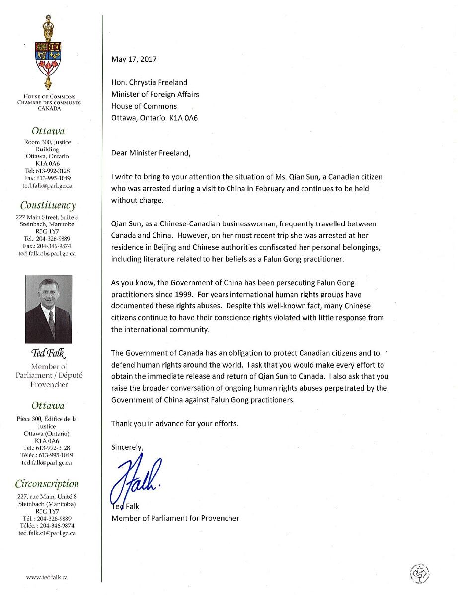 加国会议员Ted Falk在给加拿大总理Justin Trudeau和外交部长方慧兰的信中提出对加拿大公民孙茜女士的关注。