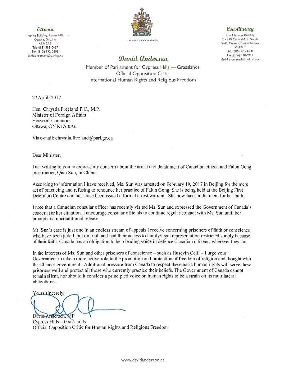 国会议员David Anderson写信给外交部长,表达对在中国被非法拘捕关押的加拿大公民、法轮功学员孙茜的担忧。