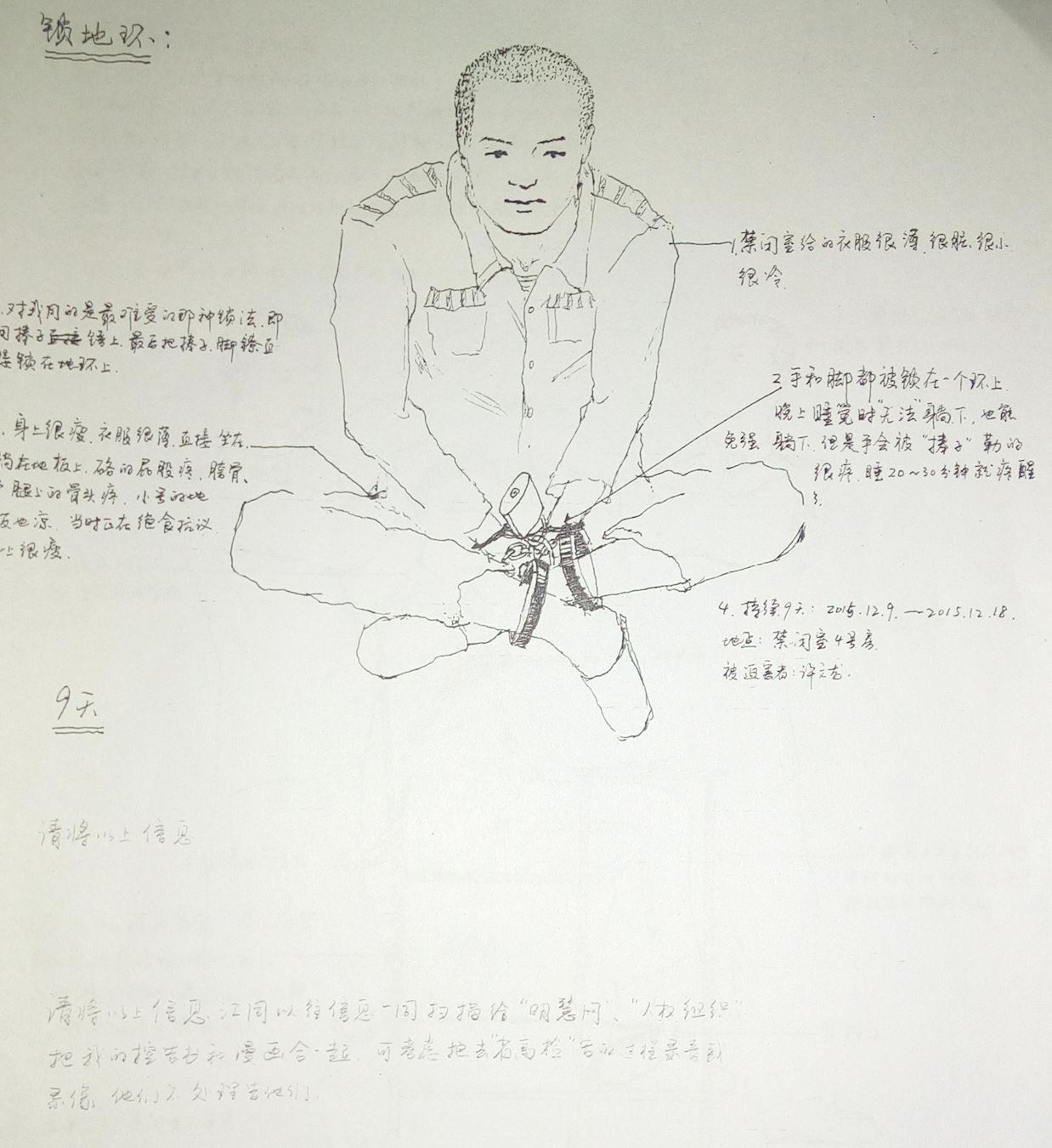 ![]() 酷刑演示图:强迫坐“老虎凳”,头部、脸部、脖子、眼睛被狱警喷入大量的辣椒水。 |