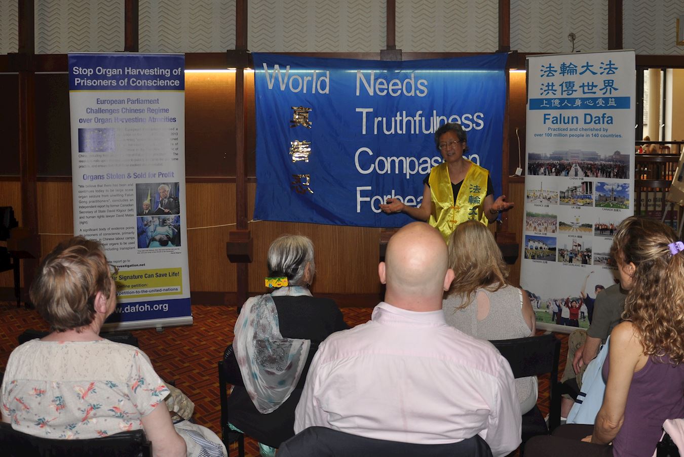 活动结束前,法轮功学员黄女士和赛米斯(Themis)向来宾们分享了自己修炼后的体会与收获。