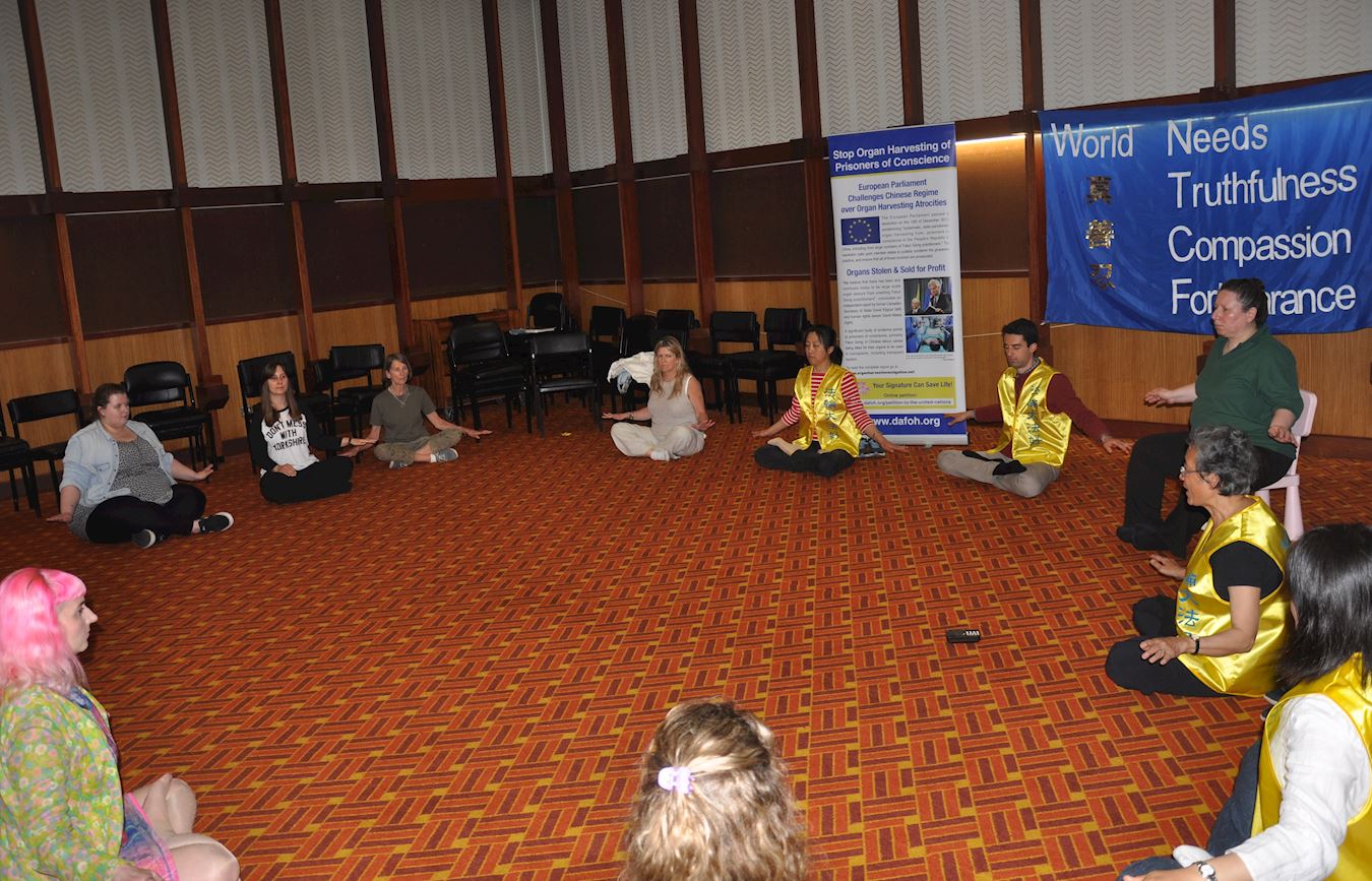 听了介绍后,来宾们开始学炼五套功法。法轮功学员每教完一套功法便请来宾们和在场的学员一起随着音乐炼功,让来宾们亲自体验法轮功带给他们内心的宁静。