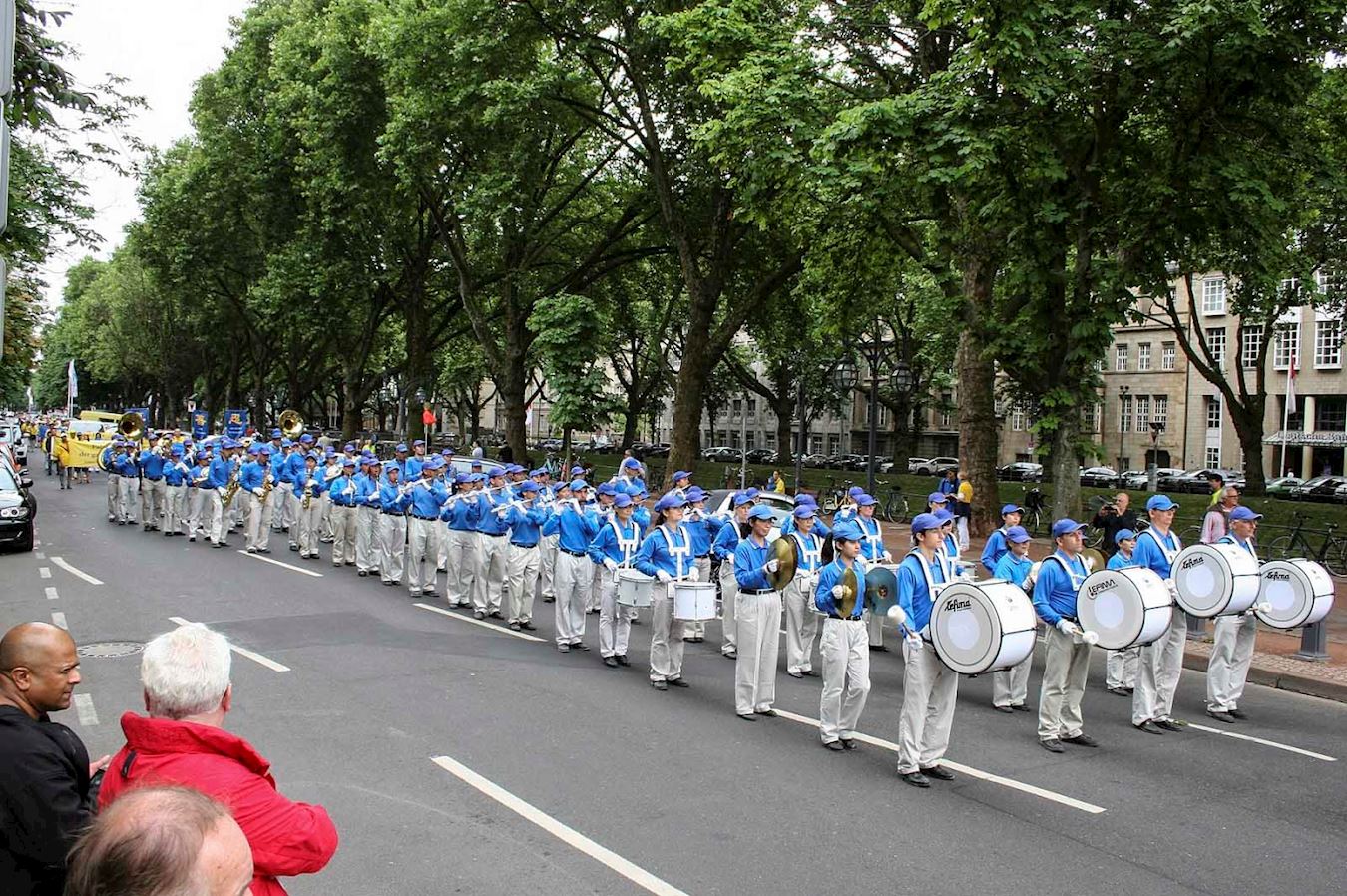 整个游行队伍以威武雄壮的天国乐团领头,接着是身着中国古代仙女装的法轮功学员在花车上演示功法,然后是大量中德语横幅的方阵,悼念被迫害致死的大陆法轮功学员的白衣女士方阵紧随其后,最后是身着中国民间金色服饰的腰鼓队。队伍绵延近两公里,德国警车为游行开道,沿途保护。
