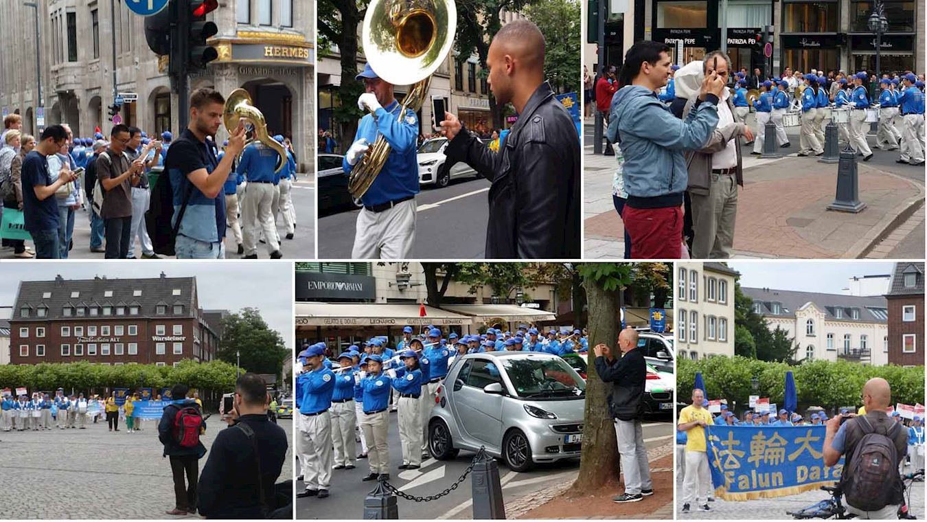 中午一点,游行队伍从市中心的王宫花园出发,途径杜塞尔多夫市中心的高档商业街区——国王大道(K?nigsallea),行至莱茵河畔的老市政厅前的城堡广场(Burgplatz)和市中心的沙都夫广场(Schadowplatz)时,法轮功学员举行了集会,人权组织代表、西方媒体记者和中国受迫害法轮功学员代表等发表演讲,下午五点游行和集会结束。