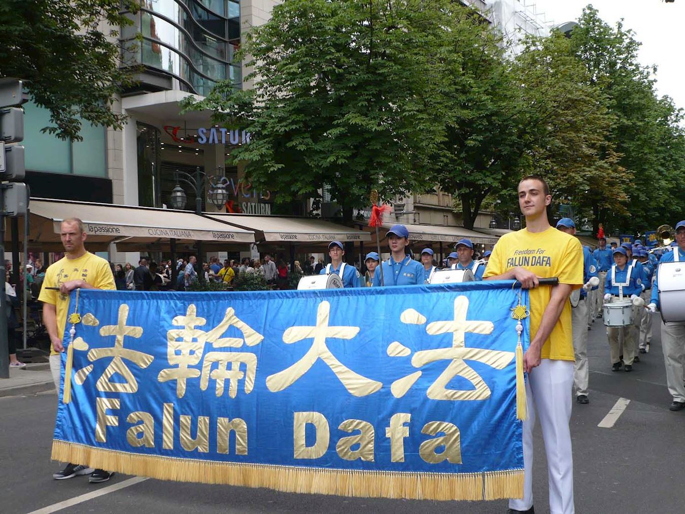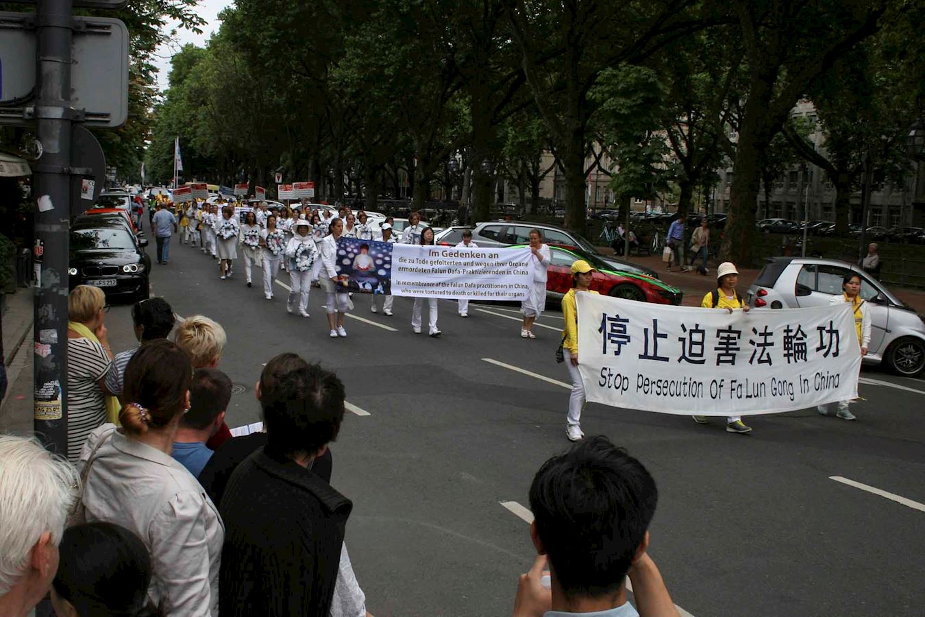 ![]() 图2:游行中,法轮功学员手持大量中德文横幅 |