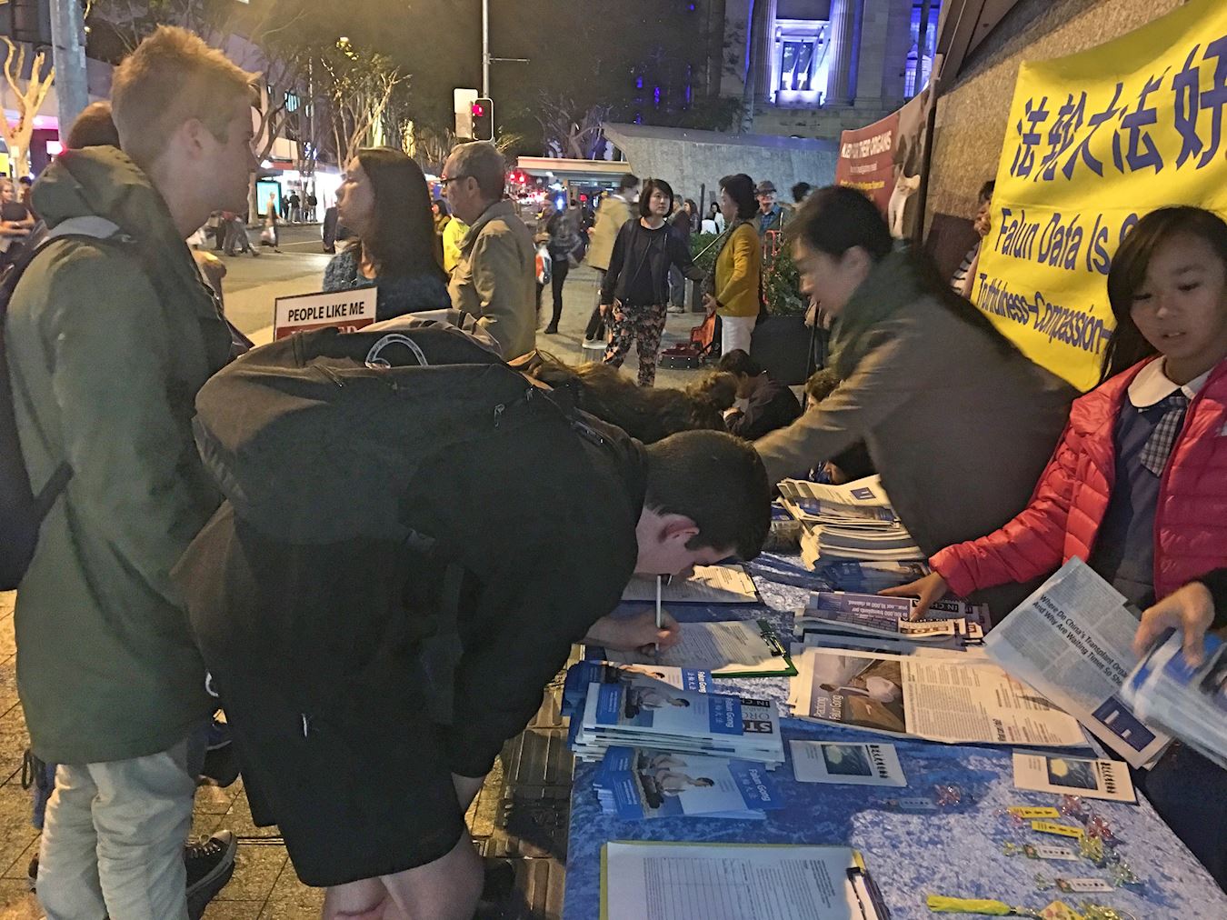 来自澳大利亚新南威尔士州麦觉理(Macquarie)的贝蕾(Bayleigh Duck)和科林(Colin Coelho)是一对善良的情侣,一直致力于救助伤残儿童的志愿服务。当他们了解到中共活摘法轮功学员器官的暴行后,感到非常震惊,并说:“这是极其可怕的国家犯罪!必须采取行动!你们的征签活动很重要!”贝蕾在反活摘征签簿上签完名后对学员说,“应该让更多、更多的人都来签名,只有让邪恶曝光于全世界,才会给中共压力。”他们还拿了真相资料,表示回去要进一步好好了解,并想办法支持法轮功反迫害。