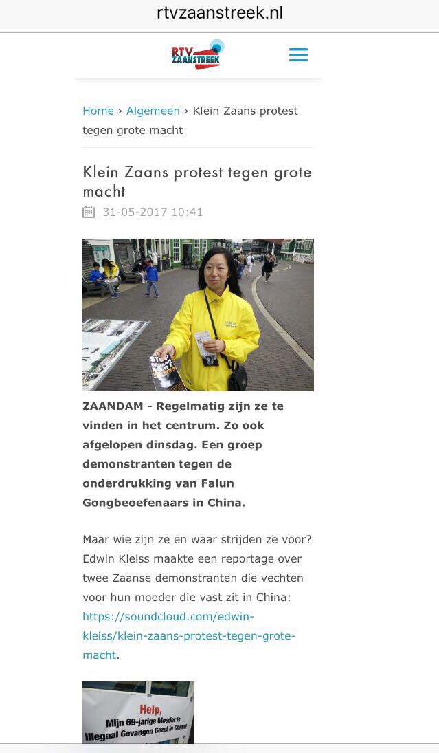二零一七年五月三十日,张女士及部分学员来到Zaandam城市进行洪法活动并揭露她母亲彭杰被迫害的情况。当地广播电台及北荷兰日报也来到现场并对张女士进行了采访报道。