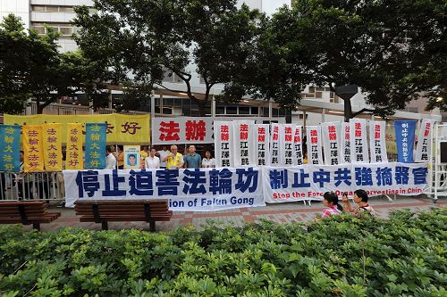 香港部份法轮功学员在其车队途经的街道和平展示“法轮大法好”、“世界需要真善忍”及“停止迫害法轮功”、“法办江泽民、梁振英”等横幅。下午四时半,法轮功学员从中环遮打花园游行到警方指定的示威区炮台里,向准备到礼宾府出席晚宴的习*近*平和平呼吁。